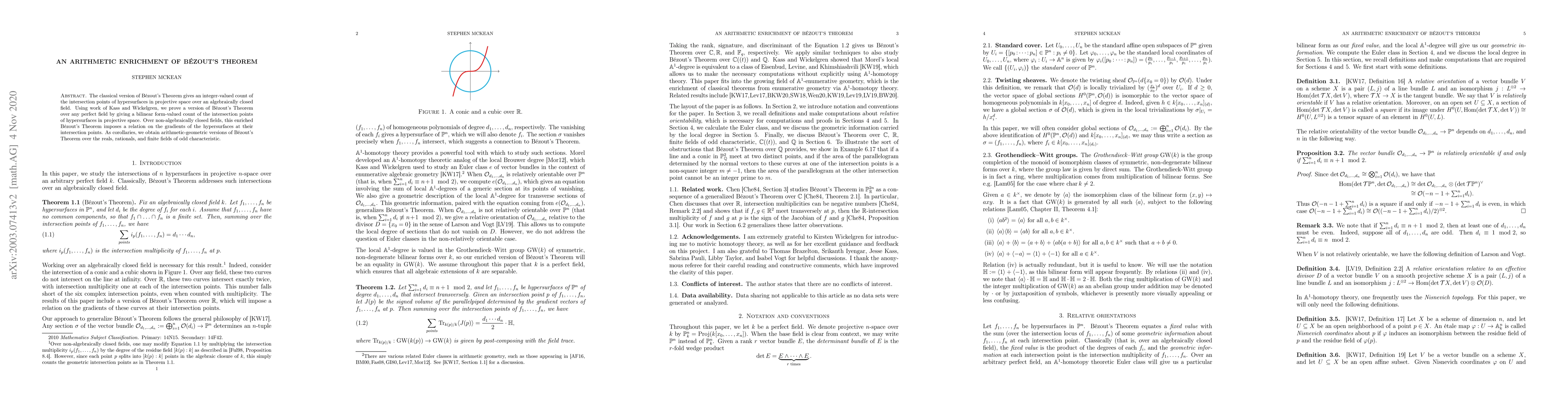This paper extends B\'ezout's Theorem to perfect fields using a bilinear form-valued intersection count, providing a relation on gradients over non-algebraically closed fields, and yielding arithmetic-geometric versions for reals, rationals, and finite fields of odd characteristic.