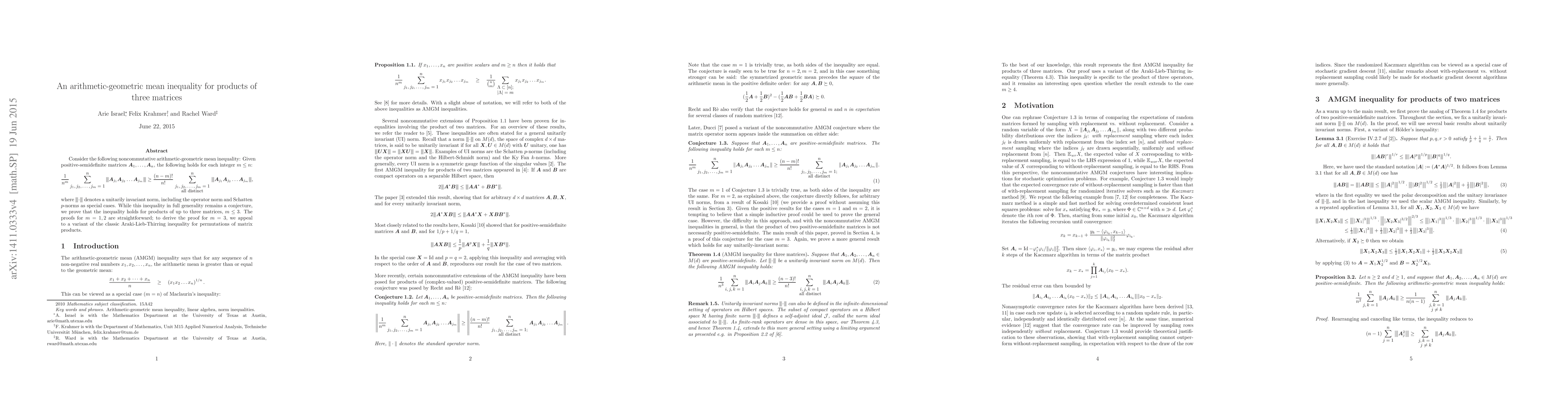 This paper proves a noncommutative arithmetic-geometric mean inequality for products of up to three positive-semidefinite matrices, showing that the inequality holds for $m \leq 3$. The proofs for $m=1$ and $2$ are straightforward, while the case for $m=3$ uses a variant of the Araki-Lieb-Thirring inequality.