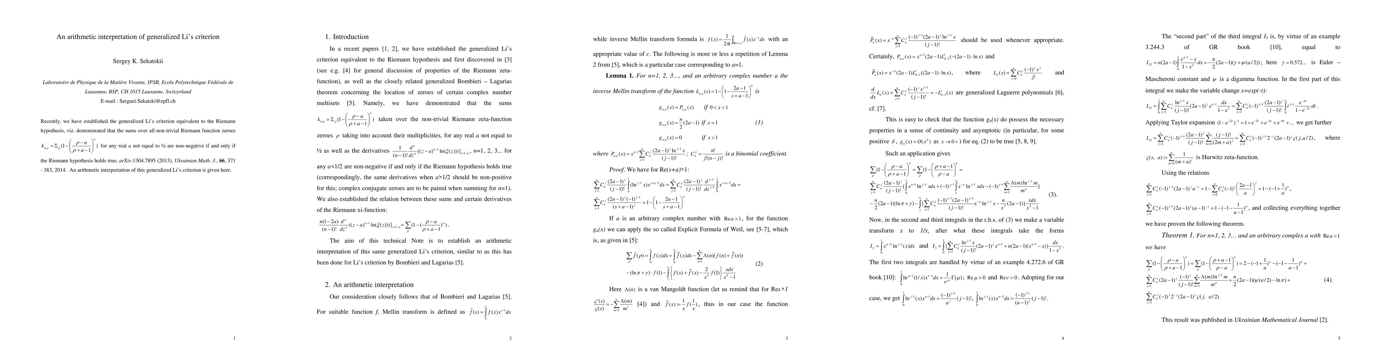 Recently, we have established the generalized Li's criterion equivalent to the Riemann hypothesis, viz. demonstrated that the sums over all non-trivial Riemann function zeroes k_n,a=Sum_rho(1-(1-((rho-a)/(rho+a-1))^n) for any real a not equal to 1/2 are non-negative if and only if the Riemann hypothesis holds true; arXiv:1304.7895 (2013); Ukrainian Math. J., V.66, N3, 371-383 (2014). An arithmetic interpretation of this generalized Li's criterion is given here.