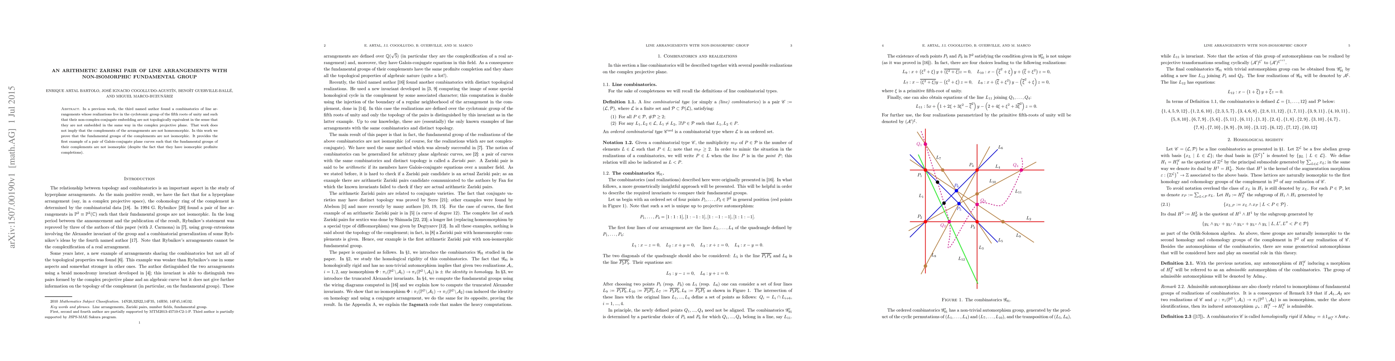 In a previous work, the third named author found a combinatorics of line arrangements whose realizations live in the cyclotomic group of the fifth roots of unity and such that their non-complex-conjugate embedding are not topologically equivalent in the sense that they are not embedded in the same way in the complex projective plane. That work does not imply that the complements of the arrangements are not homeomorphic. In this work we prove that the fundamental groups of the complements are not isomorphic. It provides the first example of a pair of Galois-conjugate plane curves such that the fundamental groups of their complements are not isomorphic (despite the fact that they have isomorphic profinite completions).