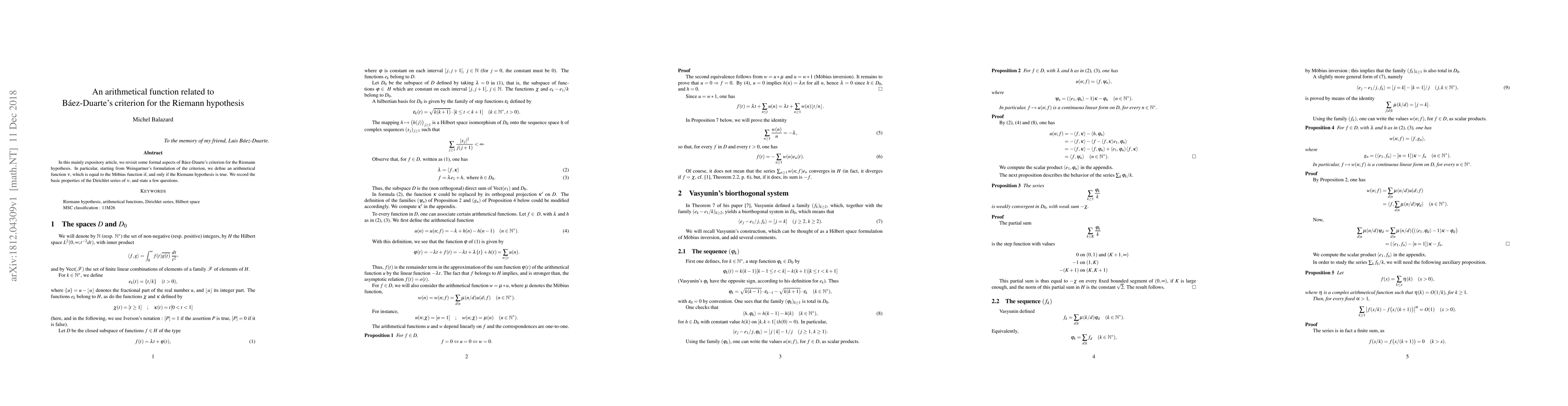 In this mainly expository article, we revisit some formal aspects of B{\'a}ez-Duarte's criterion for the Riemann hypothesis. In particular, starting from Weingartner's formulation of the criterion, we define an arithmetical function $\nu$, which is equal to the M{\"o}bius function if, and only if the Riemann hypothesis is true. We record the basic properties of the Dirichlet series of $\nu$, and state a few questions. KEYWORDS: Riemann hypothesis, arithmetical functions, Dirichlet series, Hilbert space