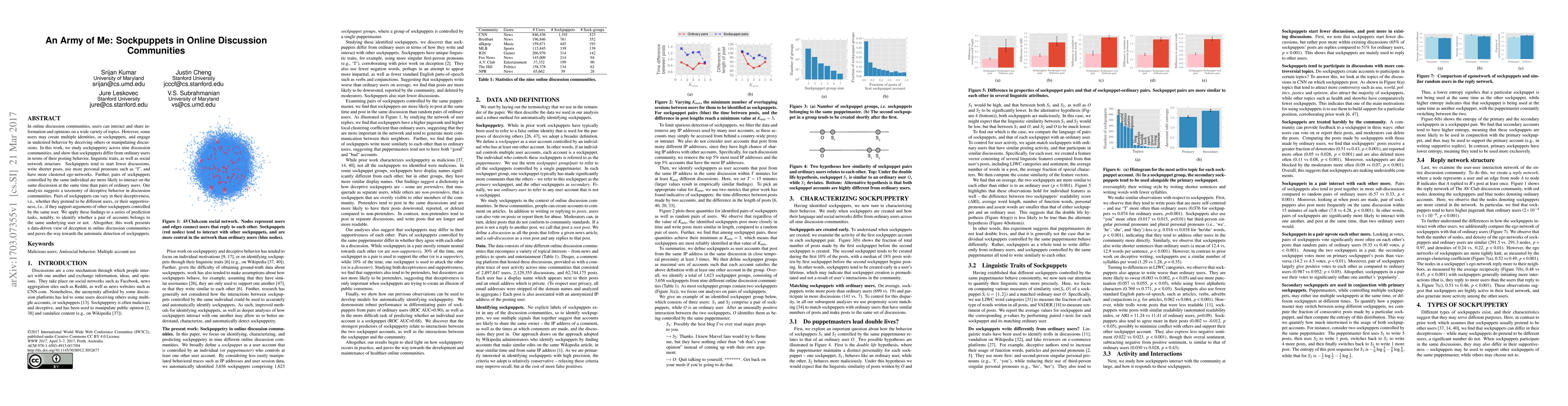 This paper investigates sockpuppetry in online discussion communities, revealing distinct behavioral, linguistic, and social network differences between sockpuppets and ordinary users. The study identifies patterns such as shorter posts, increased use of personal pronouns, and more clustered ego-networks among sockpuppets, aiding in the automatic detection of deceptive users.