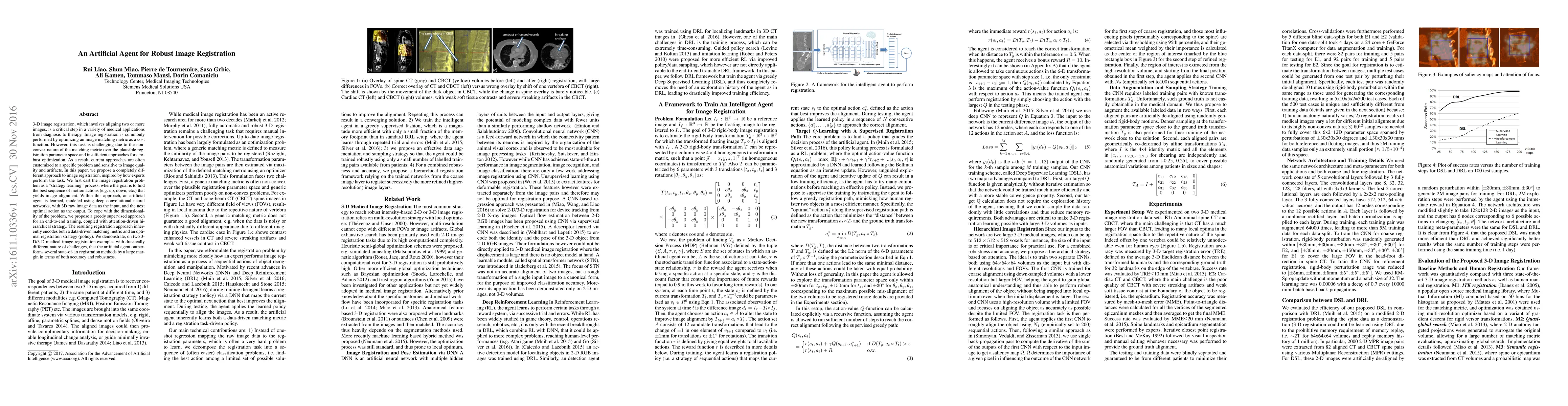 This paper proposes an artificial agent using deep convolutional neural networks for robust 3-D image registration, framing the task as a "strategy learning" process. The agent learns optimal motion actions from raw 3D image data, outperforming existing methods in accuracy and robustness.