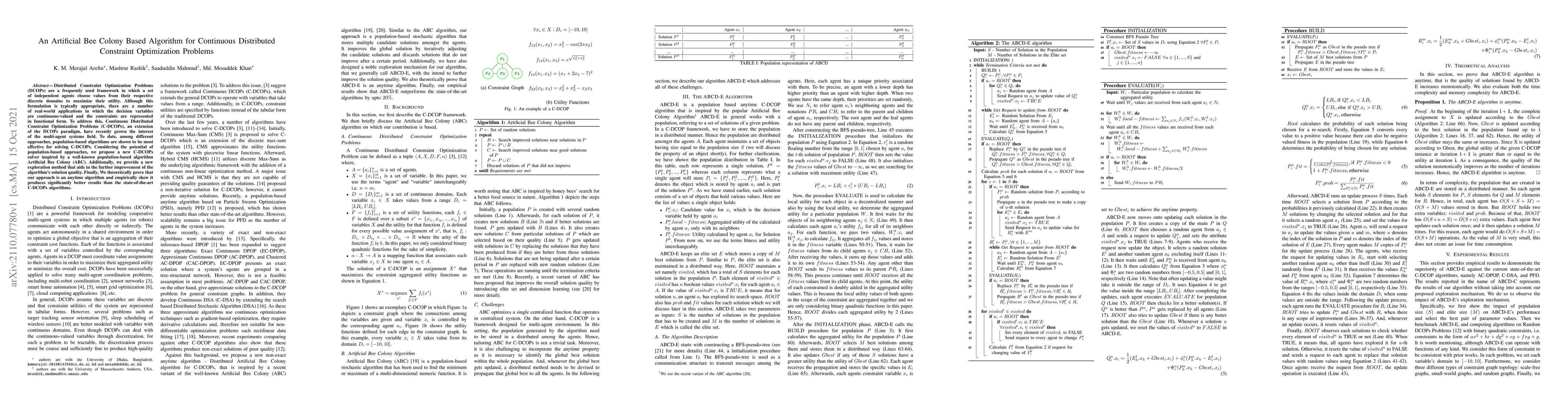 This paper proposes an Artificial Bee Colony (ABC) based algorithm to solve Continuous Distributed Constraint Optimization Problems (C-DCOPs), enhancing solution quality through a new exploration method. The authors prove the algorithm's anytime nature and demonstrate its superior performance over existing C-DCOPs solvers.