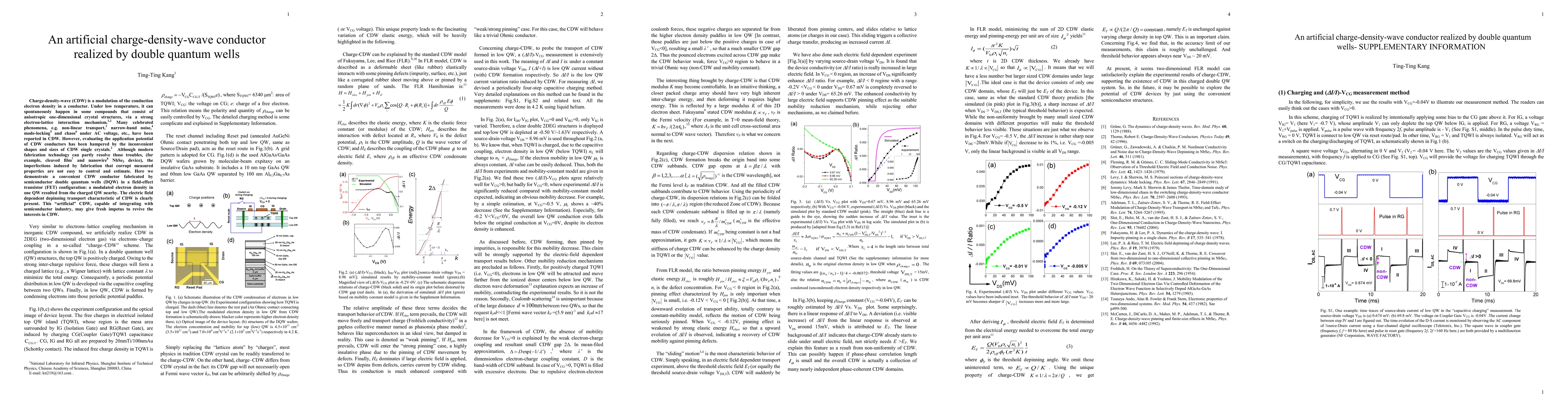 Charge-density-wave (CDW) is a modulation of the conduction electron density in a conductor. Under low temperature, it can spontaneously happen in some compounds that consist of anisotropic one-dimensional crystal structures, via a strong electron-lattice interaction mechanism. Many celebrated phenomena, e.g. non-linear transport, narrow-band noise, mode-locking5 and chaos under AC voltage, etc., have been reported in CDW. However, evaluating the application potential of CDW conductors has been hampered by the inconvenient shapes and sizes of CDW single crystals. Although modern fabrication technology can partly resolve those troubles, (for example, cleaved film and nanowire NbSe3 device), the imperfections induced by fabrication that corrupt measured properties are not easy to control and estimate. Here we demonstrate a convenient CDW conductor fabricated by semiconductor double quantum wells (DQW) in a field-effect transistor (FET) configuration: a modulated electron density in one QW resulted from the charged QW nearby. The electric field dependent depinning transport characteristic of CDW is clearly present. This "artificial" CDW, capable of integrating with semiconductor industry, may give fresh impetus to revive the interests in CDW.