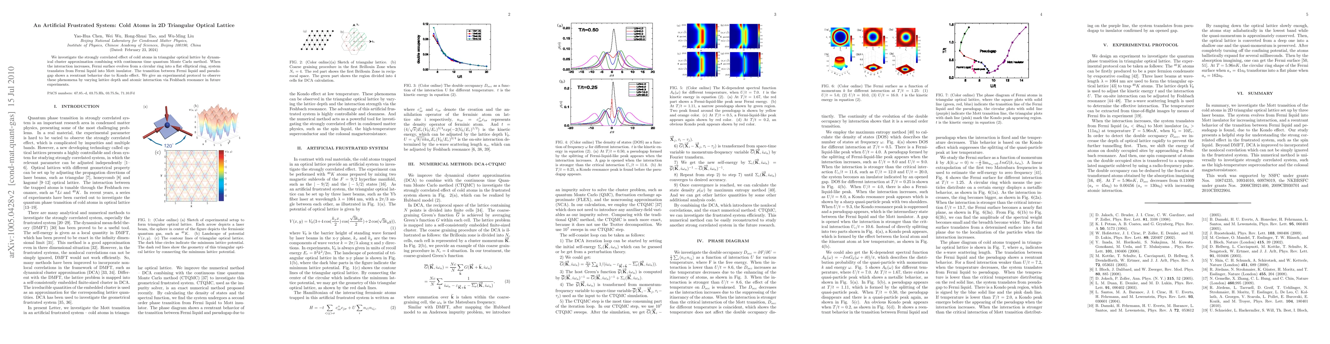 We investigate the strongly correlated effect of cold atoms in triangular optical lattice by dynamical cluster approximation combining with the continuous time quantum Monte Carlo method proposed recently. It is found the double occupancy is suppressed as the atomic interaction increases. By calculating the density of states, we show how the system evolves from Fermi liquid with an obvious quasi-particle peak into Mott insulator with an opened gap for increasing interaction. The transition between Fermi liquid and pseudogap shows a reentrant behavior due to the Kondo effect. At low temperature, a Kondo peak appears before the splitting of the Fermi-liquid-like peak. The Fermi surface evolves from a circular ring with high amplitude into a {\deg}at elliptical ring with low amplitude for the increasing interaction. We give an experimental protocol to observe these phenomena by varying the lattice depth and the atomic interaction via Feshbach resonance in future experiments.