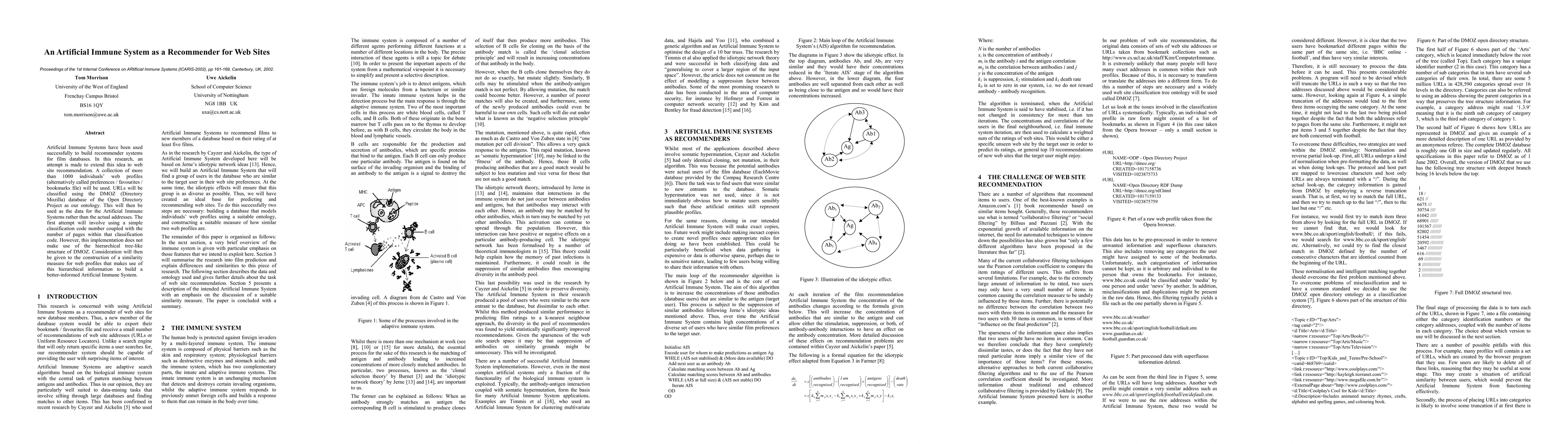 This research explores the application of Artificial Immune Systems to recommend websites based on user profiles, using DMOZ classification for ontology. Initial efforts focus on a simple classification code, but future work aims to incorporate the hierarchical structure of DMOZ for a more informed recommendation system.