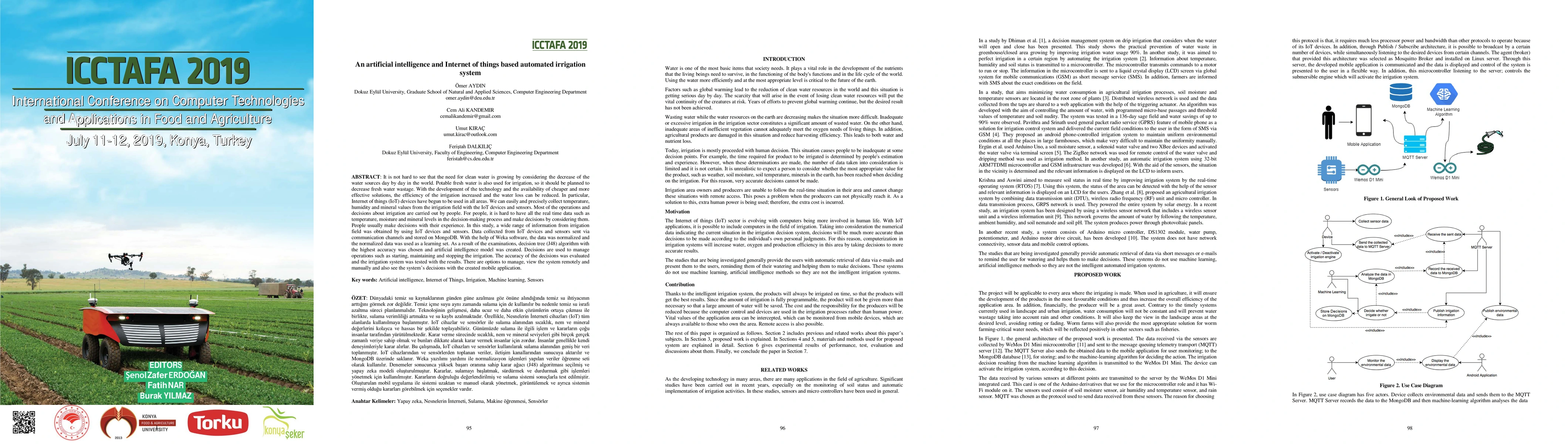 This research develops an automated irrigation system using artificial intelligence and IoT to reduce freshwater wastage. IoT devices collect real-time data on temperature, humidity, and mineral values, which are analyzed using a decision tree algorithm for precise irrigation management, evaluated for accuracy, and monitored via a mobile application.