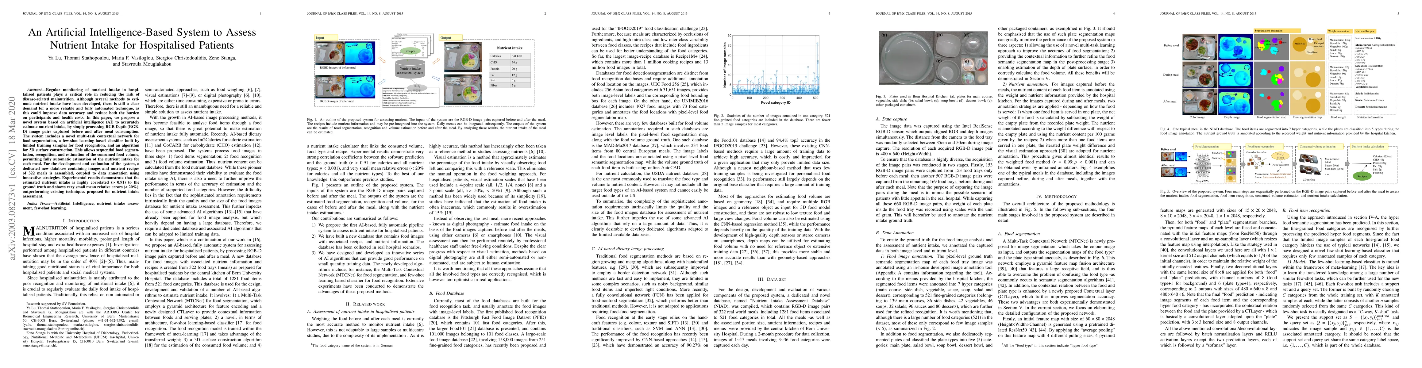 This paper proposes an AI-based system to automatically estimate nutrient intake in hospitalized patients using RGB-D images. The system combines food segmentation, recognition, and volume estimation to accurately assess consumed food, demonstrating high correlation and low error rates compared to existing methods.