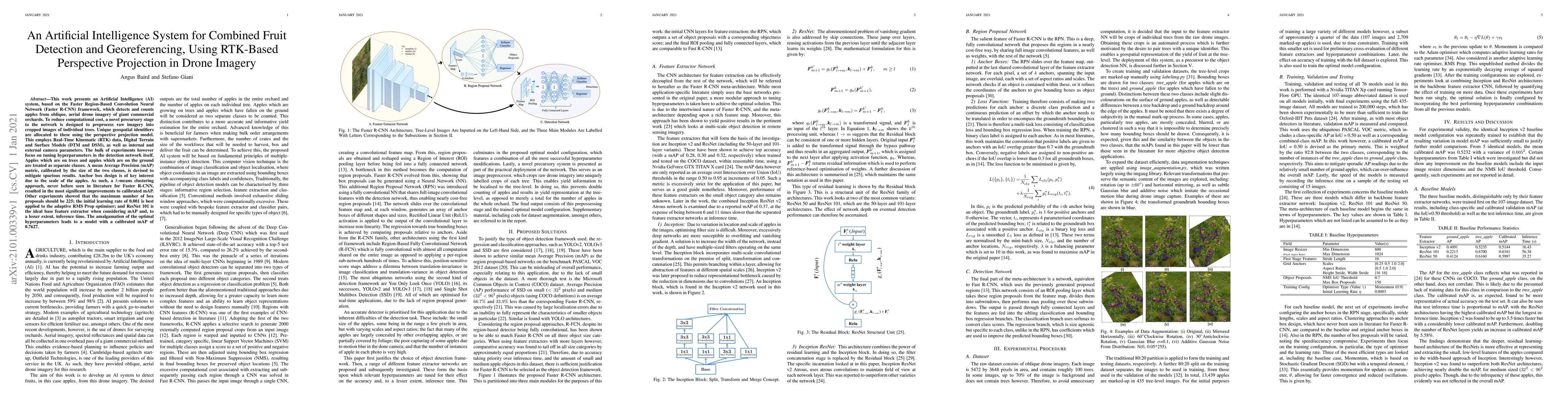 This research introduces an AI system using Faster R-CNN for detecting and counting apples in drone images of orchards. It employs a precursory stage to preprocess images and assigns geospatial identifiers using RTK data and 3D models. Key improvements come from a novel k-means clustering approach for anchor box design, yielding a calibrated mAP of 0.7627 with optimal hyperparameters.