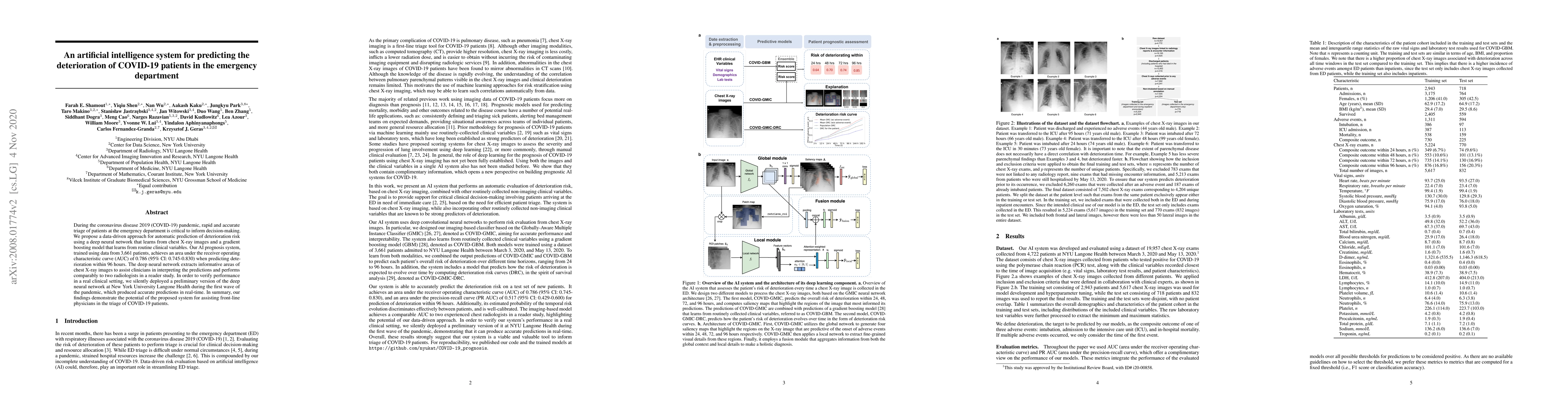 This paper proposes an AI system for predicting COVID-19 patient deterioration in the emergency department using deep learning from chest X-rays and gradient boosting from clinical data, achieving an AUC of 0.786. The system was deployed in a real clinical setting, demonstrating its potential to assist physicians in patient triage.