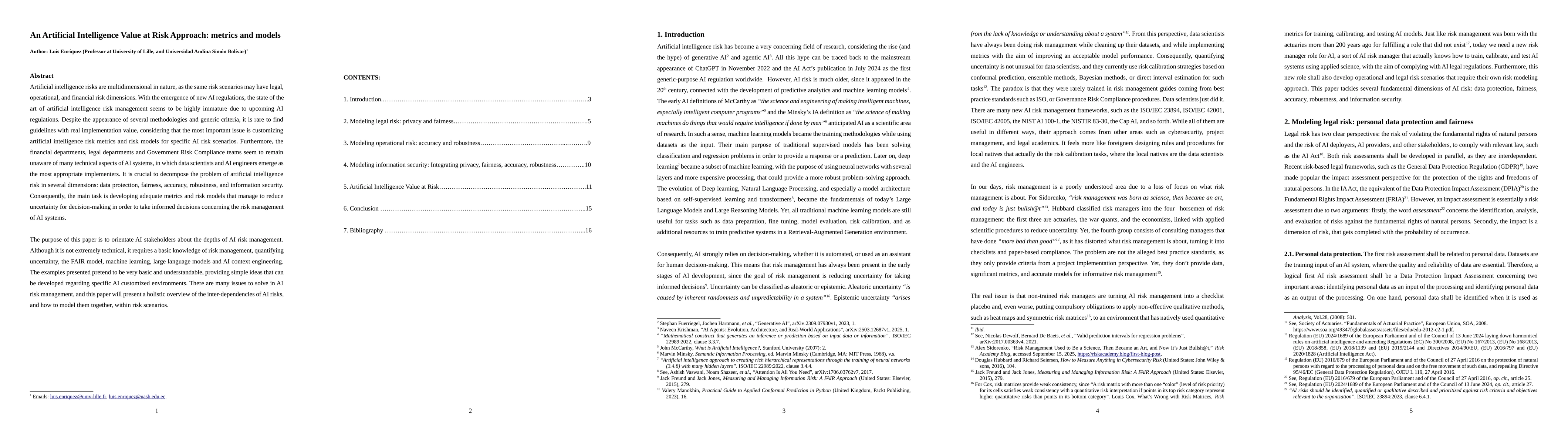 Artificial intelligence risks are multidimensional in nature, as the same risk scenarios may have legal, operational, and financial risk dimensions. With the emergence of new AI regulations, the state of the art of artificial intelligence risk management seems to be highly immature due to upcoming AI regulations. Despite the appearance of several methodologies and generic criteria, it is rare to find guidelines with real implementation value, considering that the most important issue is customizing artificial intelligence risk metrics and risk models for specific AI risk scenarios. Furthermore, the financial departments, legal departments and Government Risk Compliance teams seem to remain unaware of many technical aspects of AI systems, in which data scientists and AI engineers emerge as the most appropriate implementers. It is crucial to decompose the problem of artificial intelligence risk in several dimensions: data protection, fairness, accuracy, robustness, and information security. Consequently, the main task is developing adequate metrics and risk models that manage to reduce uncertainty for decision-making in order to take informed decisions concerning the risk management of AI systems. The purpose of this paper is to orientate AI stakeholders about the depths of AI risk management. Although it is not extremely technical, it requires a basic knowledge of risk management, quantifying uncertainty, the FAIR model, machine learning, large language models and AI context engineering. The examples presented pretend to be very basic and understandable, providing simple ideas that can be developed regarding specific AI customized environments. There are many issues to solve in AI risk management, and this paper will present a holistic overview of the inter-dependencies of AI risks, and how to model them together, within risk scenarios.