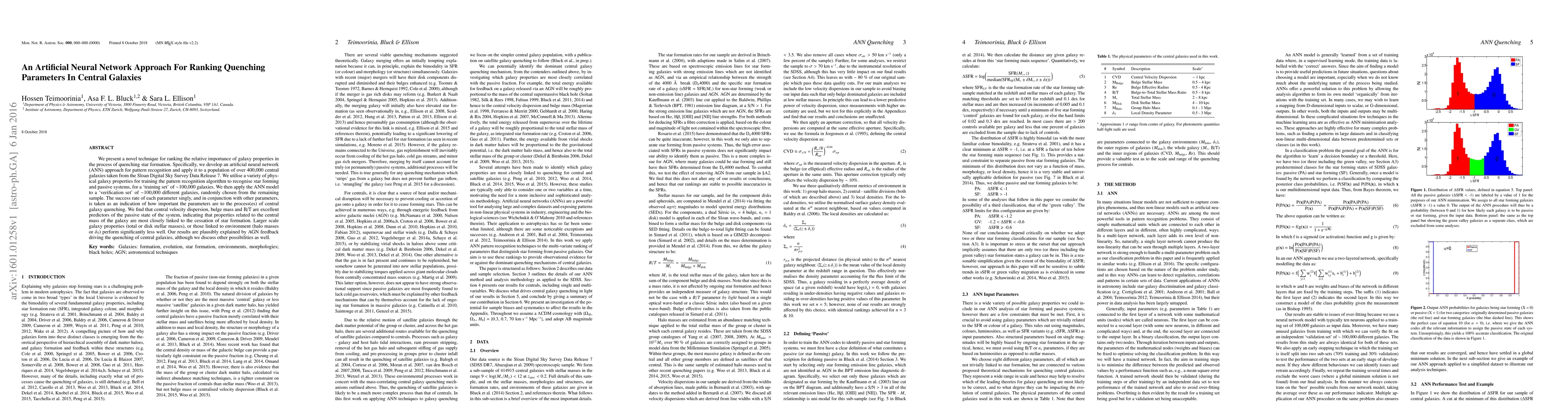 This paper introduces an artificial neural network (ANN) approach to rank the importance of galaxy properties in quenching star formation in central galaxies. The ANN model, trained on over 100,000 galaxies, identifies central velocity dispersion, bulge mass, and B/T ratio as key predictors of galaxy quenching, suggesting AGN feedback as a plausible mechanism.