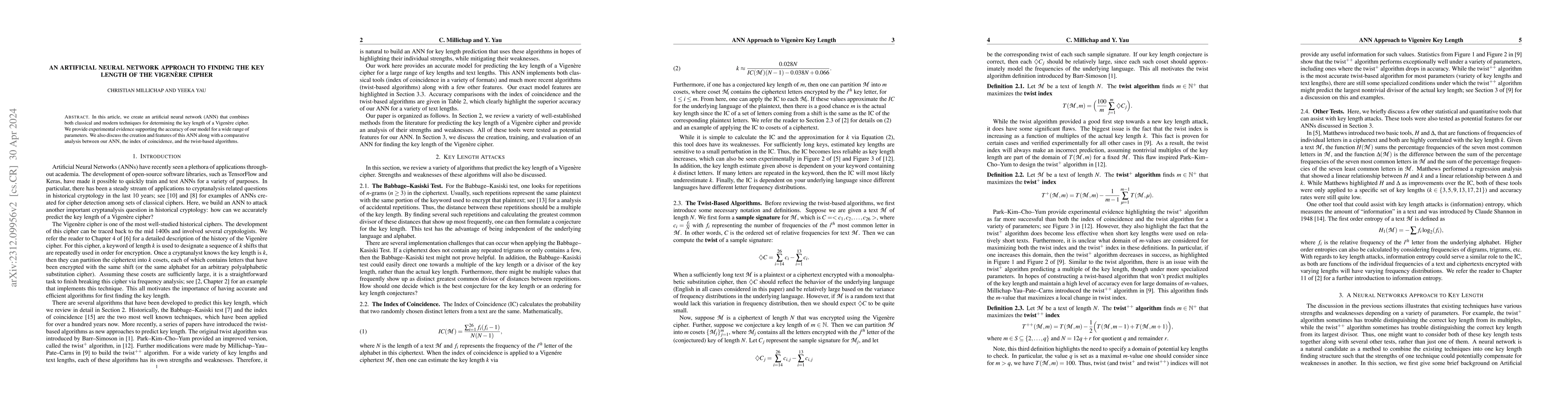 This paper introduces an artificial neural network for determining the key length of a Vigenère cipher, combining classical and modern techniques. The ANN's accuracy is validated experimentally, and it is compared against traditional methods like the index of coincidence and twist-based algorithms.