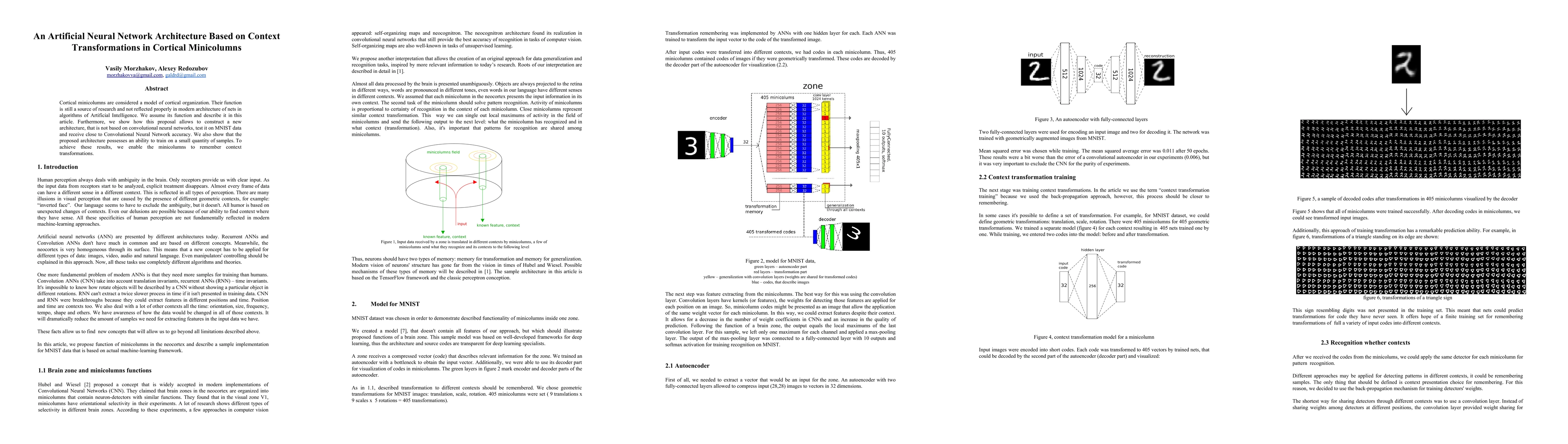 Cortical minicolumns are considered a model of cortical organization. Their function is still a source of research and not reflected properly in modern architecture of nets in algorithms of Artificial Intelligence. We assume its function and describe it in this article. Furthermore, we show how this proposal allows to construct a new architecture, that is not based on convolutional neural networks, test it on MNIST data and receive close to Convolutional Neural Network accuracy. We also show that the proposed architecture possesses an ability to train on a small quantity of samples. To achieve these results, we enable the minicolumns to remember context transformations.