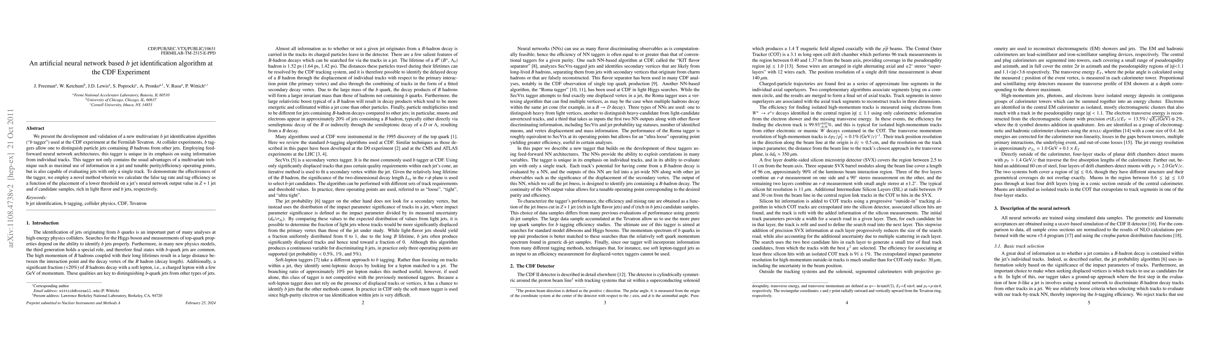 We present the development and validation of a new multivariate $b$ jet identification algorithm ("$b$ tagger") used at the CDF experiment at the Fermilab Tevatron. At collider experiments, $b$ taggers allow one to distinguish particle jets containing $B$ hadrons from other jets. Employing feed-forward neural network architectures, this tagger is unique in its emphasis on using information from individual tracks. This tagger not only contains the usual advantages of a multivariate technique such as maximal use of information in a jet and tunable purity/efficiency operating points, but is also capable of evaluating jets with only a single track. To demonstrate the effectiveness of the tagger, we employ a novel method wherein we calculate the false tag rate and tag efficiency as a function of the placement of a lower threshold on a jet's neural network output value in $Z+1$ jet and $t\bar{t}$ candidate samples, rich in light flavor and $b$ jets, respectively.