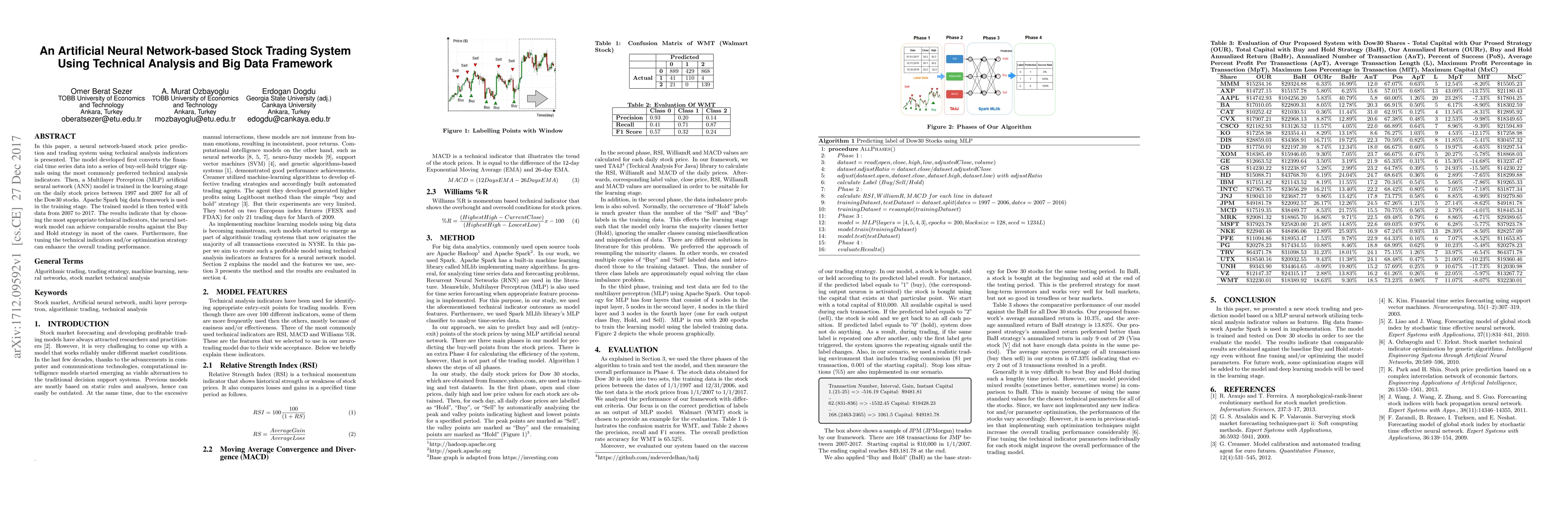 This paper presents an artificial neural network-based stock trading system that leverages technical analysis indicators and the Apache Spark big data framework for training. The model, trained on Dow30 stocks from 1997 to 2007, shows comparable performance to the Buy and Hold strategy when tested from 2007 to 2017, suggesting potential for enhanced trading performance through fine-tuning.