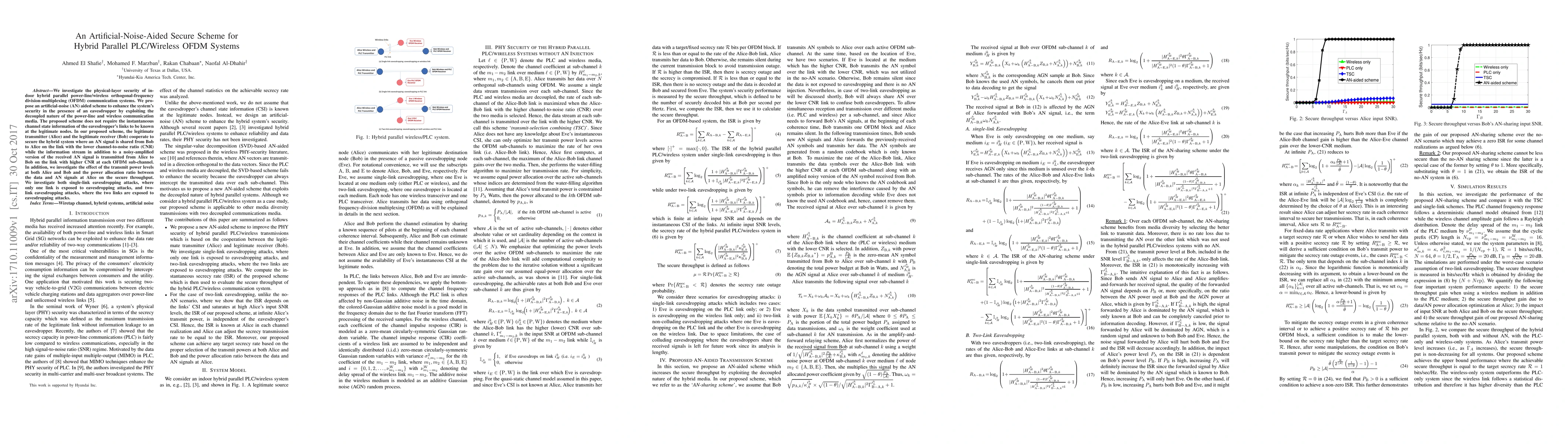 We investigate the physical-layer security of indoor hybrid parallel power-line/wireless orthogonal-frequency division-multiplexing (OFDM) communication systems. We propose an artificial-noise (AN) aided scheme to enhance the system's security in the presence of an eavesdropper by exploiting the decoupled nature of the power-line and wireless communication media. The proposed scheme does not require the instantaneous channel state information of the eavesdropper's links to be known at the legitimate nodes. In our proposed scheme, the legitimate transmitter (Alice) and the legitimate receiver (Bob) cooperate to secure the hybrid system where an AN signal is shared from Bob to Alice on the link with the lower channel-to-noise ratio (CNR) while the information stream in addition to a noisy-amplified version of the received AN signal is transmitted from Alice to Bob on the link with higher CNR at each OFDM sub-channel. In addition, we investigate the effect of the transmit power levels at both Alice and Bob and the power allocation ratio between the data and AN signals at Alice on the secure throughput. We investigate both single-link eavesdropping attacks, where only one link is exposed to eavesdropping attacks, and two-link eavesdropping attacks, where the two links are exposed to eavesdropping attacks.
