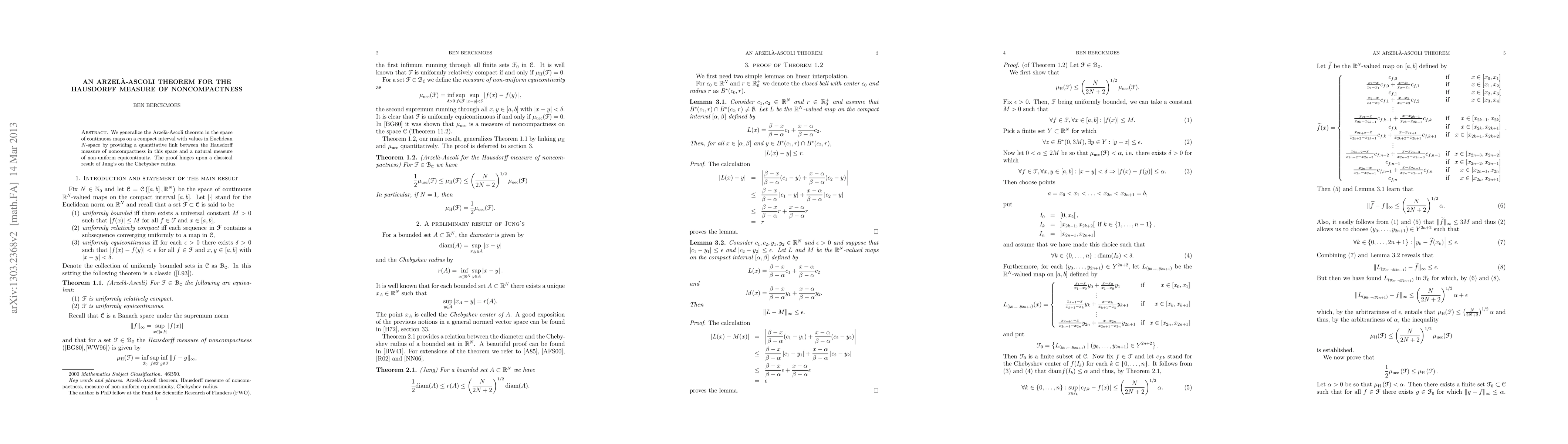 This paper generalizes the Arzel\`a-Ascoli theorem to continuous maps on a compact interval, establishing a connection between the Hausdorff measure of noncompactness and non-uniform equicontinuity, with the proof relying on Jung's result on the Chebyshev radius.