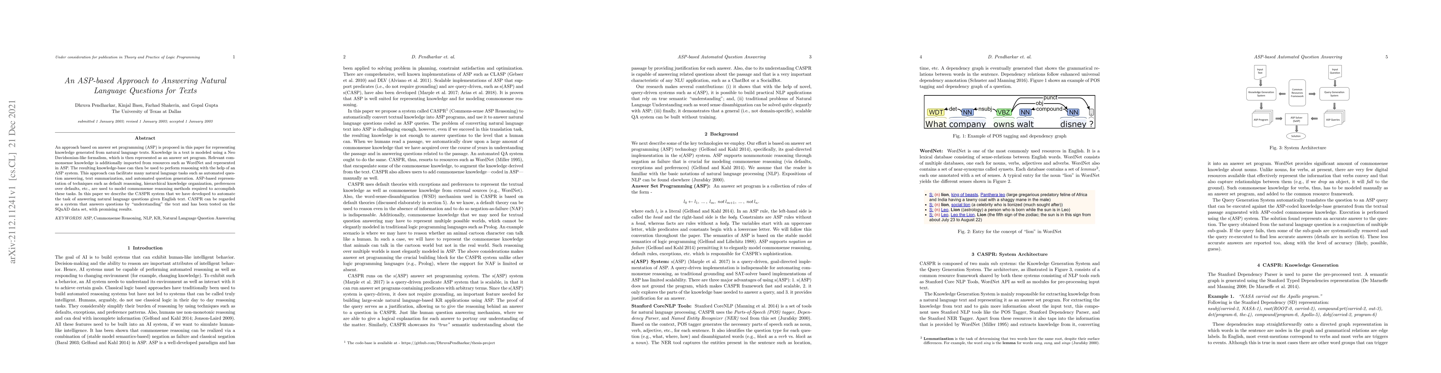 This paper proposes an answer set programming (ASP) approach to represent knowledge from natural language texts, enabling reasoning for tasks like automated question answering. The CASPR system, developed using this method, shows promising results on the SQuAD dataset.