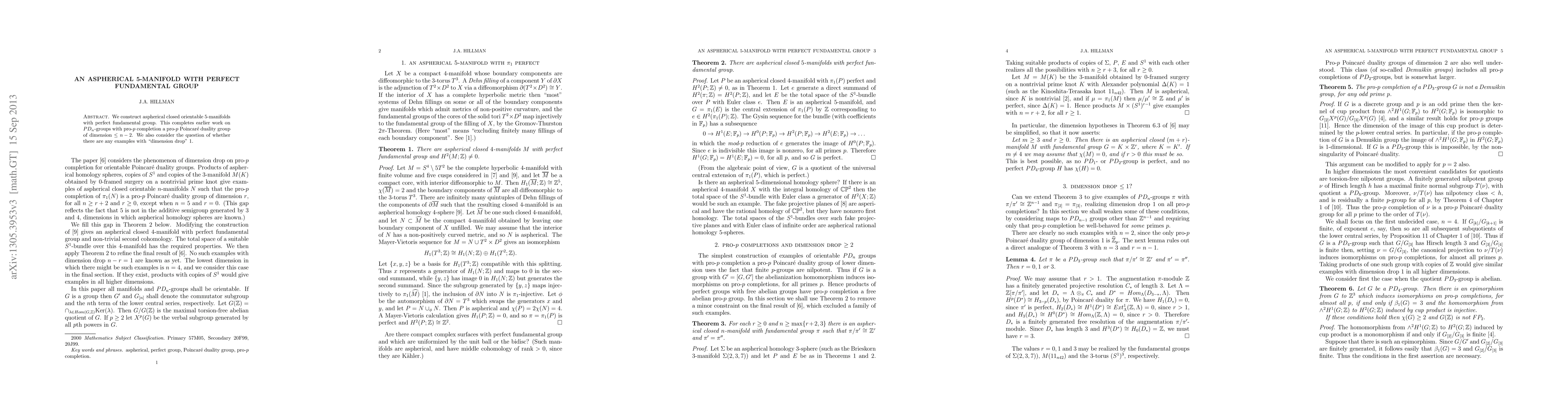 This paper constructs aspherical closed orientable 5-manifolds with perfect fundamental groups, contributing to the study of $PD_n$-groups with specific pro-$p$ completion properties. It also explores the possibility of examples with a "dimension drop" of 1.