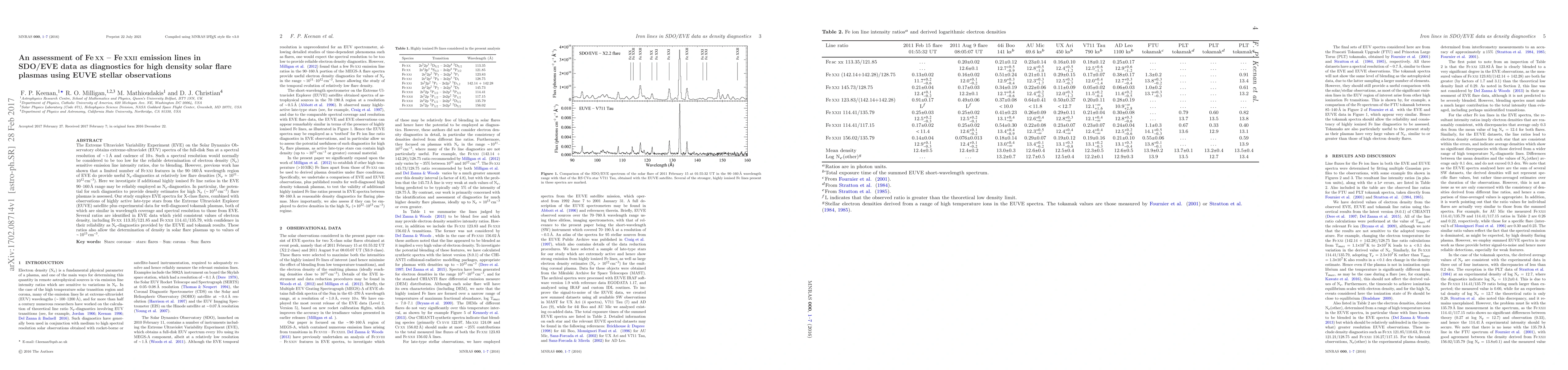 The Extreme Ultraviolet Variability Experiment (EVE) on the Solar Dynamics Observatory obtains extreme-ultraviolet (EUV) spectra of the full-disk Sun at a spectral resolution of ~1 A and cadence of 10 s. Such a spectral resolution would normally be considered to be too low for the reliable determination of electron density (N_e) sensitive emission line intensity ratios, due to blending. However, previous work has shown that a limited number of Fe XXI features in the 90-60 A wavelength region of EVE do provide useful N_e-diagnostics at relatively low flare densities (N_e ~ 10^11-10^12 cm^-3). Here we investigate if additional highly ionised Fe line ratios in the EVE 90-160 A range may be reliably employed as N_e-diagnostics. In particular, the potential for such diagnostics to provide density estimates for high N_e (~10^13 cm^-3) flare plasmas is assessed. Our study employs EVE spectra for X-class flares, combined with observations of highly active late-type stars from the Extreme Ultraviolet Explorer (EUVE) satellite plus experimental data for well-diagnosed tokamak plasmas, both of which are similar in wavelength coverage and spectral resolution to those from EVE. Several ratios are identified in EVE data which yield consistent values of electron density, including Fe XX 113.35/121.85 and Fe XXII 114.41/135.79, with confidence in their reliability as N_e-diagnostics provided by the EUVE and tokamak results. These ratios also allow the determination of density in solar flare plasmas up to values of ~10^13 cm^-3.