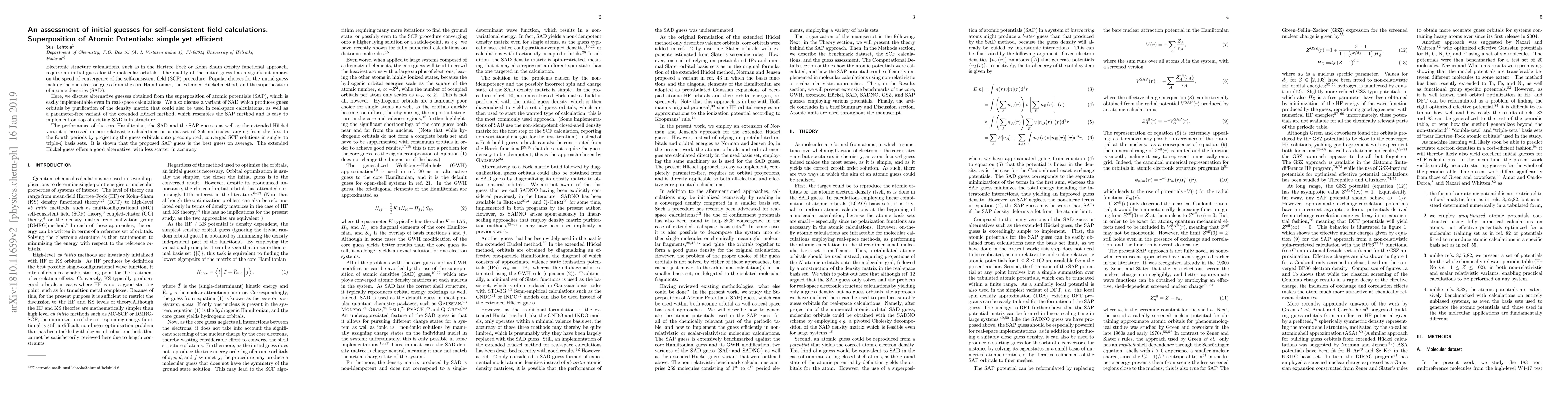 This paper evaluates various initial guesses for self-consistent field calculations, finding that the superposition of atomic potentials (SAP) provides the most efficient convergence. The study also assesses the superposition of atomic densities (SAD) and an extended H\"uckel method, showing that SAP and the extended H\"uckel method are superior on average.