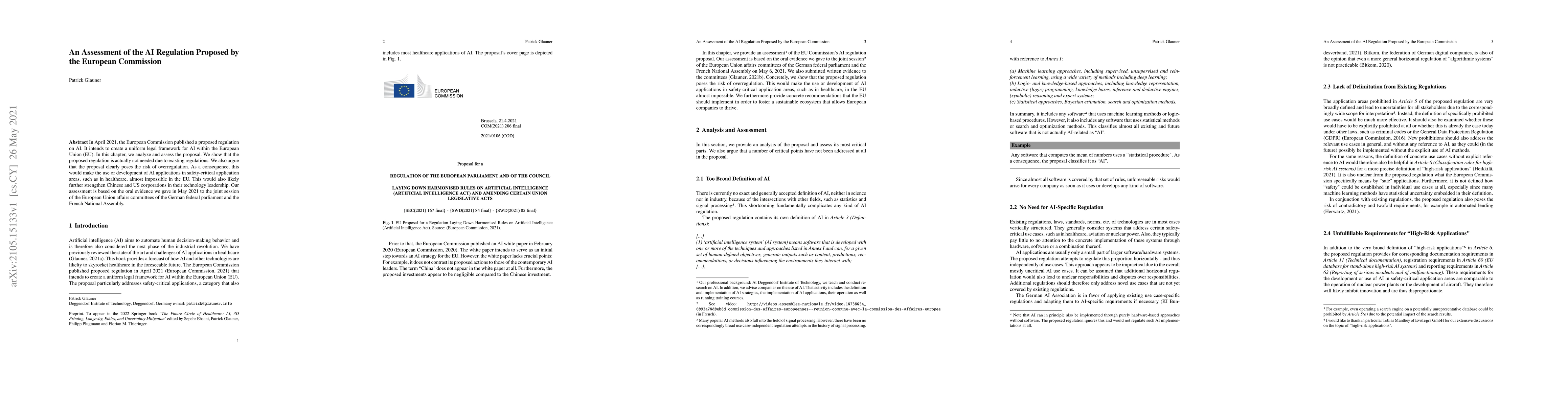 In April 2021, the European Commission published a proposed regulation on AI. It intends to create a uniform legal framework for AI within the European Union (EU). In this chapter, we analyze and assess the proposal. We show that the proposed regulation is actually not needed due to existing regulations. We also argue that the proposal clearly poses the risk of overregulation. As a consequence, this would make the use or development of AI applications in safety-critical application areas, such as in healthcare, almost impossible in the EU. This would also likely further strengthen Chinese and US corporations in their technology leadership. Our assessment is based on the oral evidence we gave in May 2021 to the joint session of the European Union affairs committees of the German federal parliament and the French National Assembly.