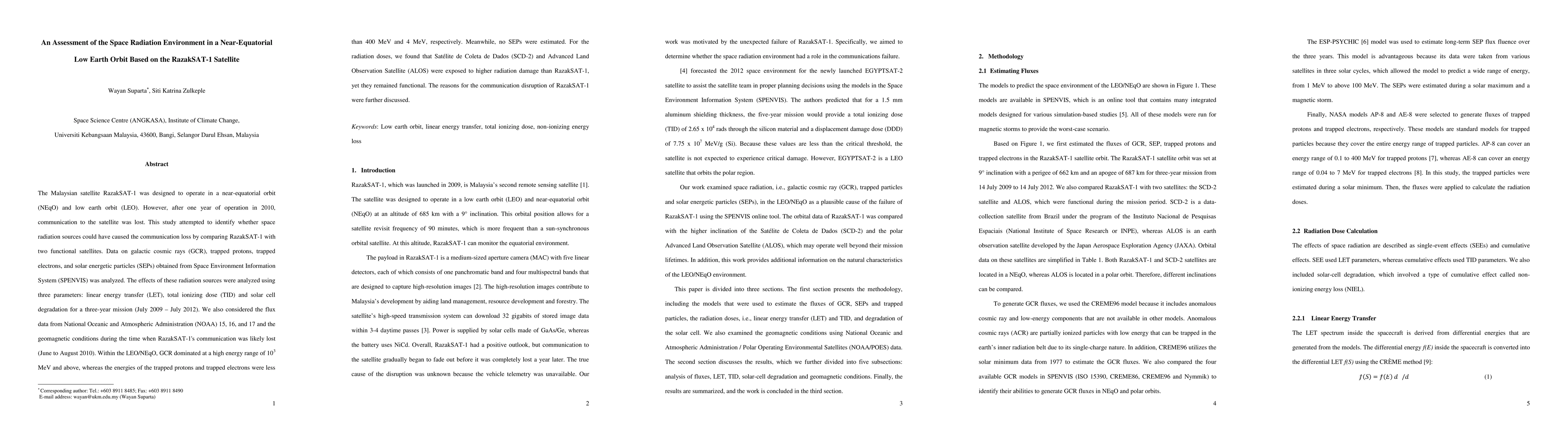 The Malaysian satellite RazakSAT-1 was designed to operate in a near-equatorial orbit (NEqO) and low earth orbit (LEO). However, after one year of operation in 2010, communication to the satellite was lost. This study attempted to identify whether space radiation sources could have caused the communication loss by comparing RazakSAT-1 with two functional satellites. Data on galactic cosmic rays (GCR), trapped protons, trapped electrons, and solar energetic particles (SEPs) obtained from Space Environment Information System (SPENVIS) was analyzed.