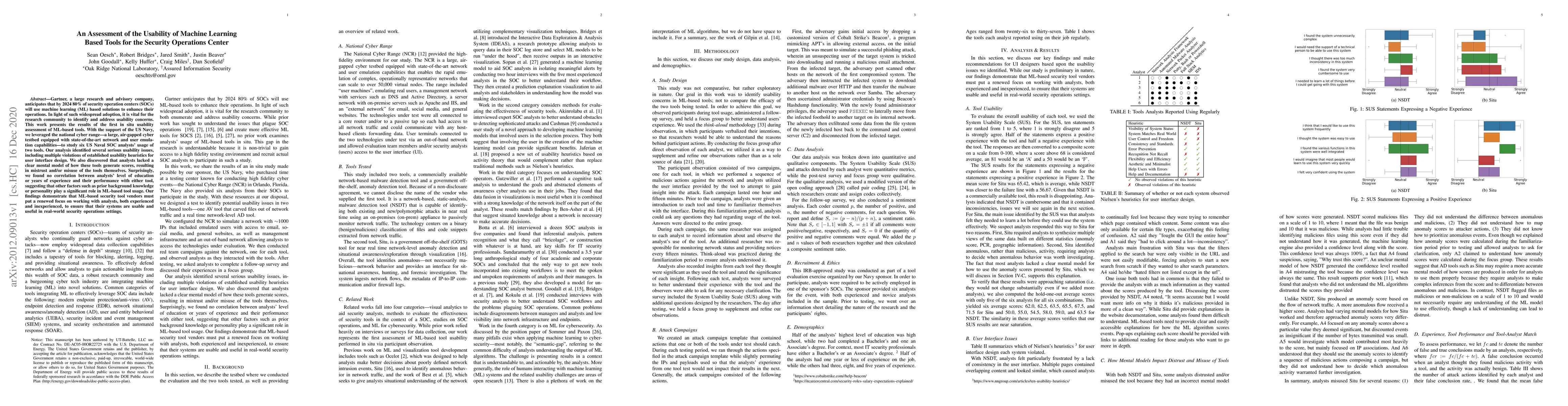 Gartner, a large research and advisory company, anticipates that by 2024 80% of security operation centers (SOCs) will use machine learning (ML) based solutions to enhance their operations. In light of such widespread adoption, it is vital for the research community to identify and address usability concerns. This work presents the results of the first in situ usability assessment of ML-based tools. With the support of the US Navy, we leveraged the national cyber range, a large, air-gapped cyber testbed equipped with state-of-the-art network and user emulation capabilities, to study six US Naval SOC analysts' usage of two tools. Our analysis identified several serious usability issues, including multiple violations of established usability heuristics form user interface design. We also discovered that analysts lacked a clear mental model of how these tools generate scores, resulting in mistrust and/or misuse of the tools themselves. Surprisingly, we found no correlation between analysts' level of education or years of experience and their performance with either tool, suggesting that other factors such as prior background knowledge or personality play a significant role in ML-based tool usage. Our findings demonstrate that ML-based security tool vendors must put a renewed focus on working with analysts, both experienced and inexperienced, to ensure that their systems are usable and useful in real-world security operations settings.