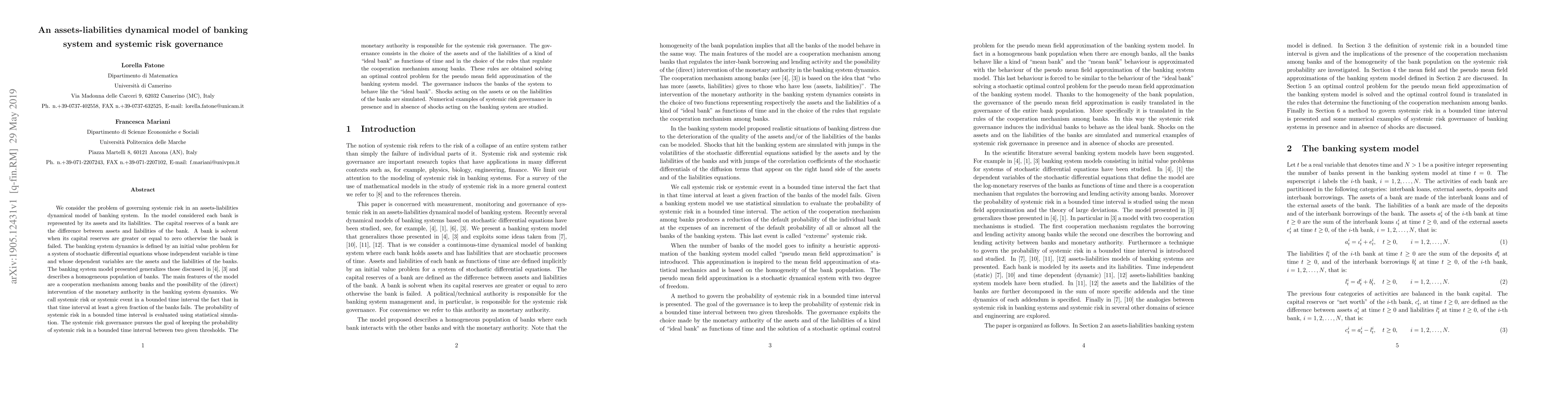 This paper develops a dynamical model of banking system assets and liabilities to govern systemic risk, where banks are represented by their assets and liabilities, and solvency is determined by capital reserves. The model uses stochastic differential equations to describe banking system dynamics, incorporating a cooperation mechanism and potential monetary authority intervention. Systemic risk is assessed via statistical simulation, with governance aiming to keep systemic risk probability between thresholds, achieved through optimal control of an "ideal bank" and cooperation rules among banks.