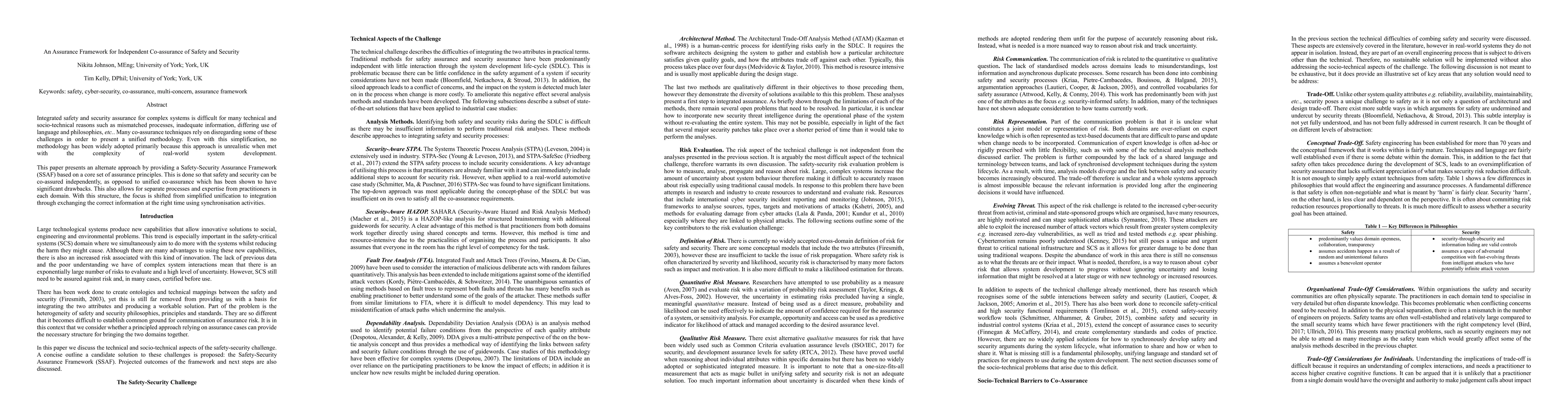 This paper introduces a Safety-Security Assurance Framework (SSAF) to independently co-assure safety and security, addressing the complexities of real-world system development by integrating separate processes and expertise, rather than attempting a unified methodology. The framework emphasizes information exchange and synchronization to achieve effective assurance.