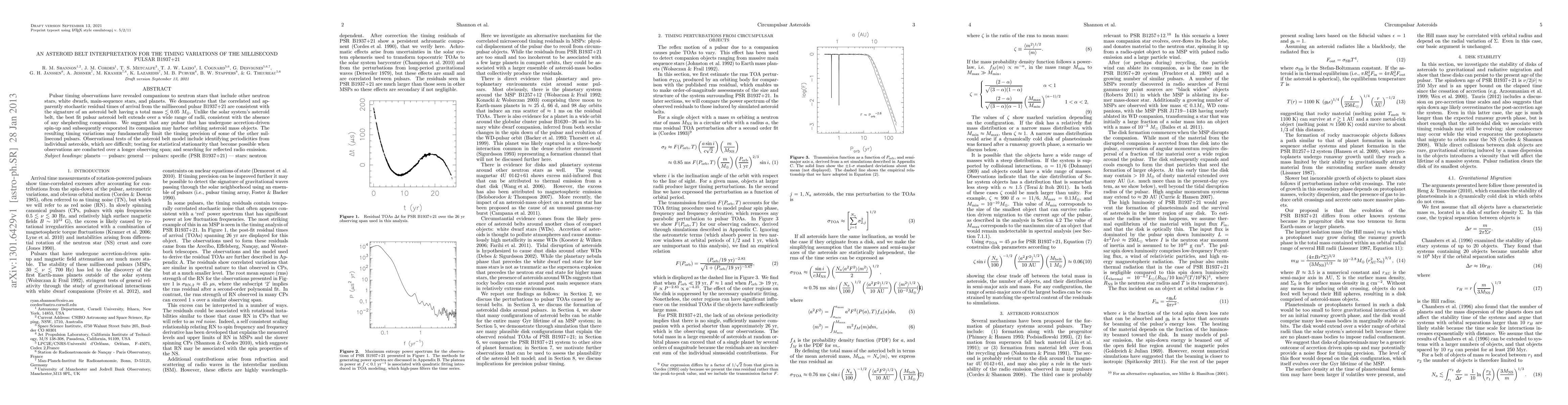 This paper proposes that the timing variations in the millisecond pulsar B1937+21 are due to an asteroid belt with a mass less than 0.05 Earth masses, unlike the solar system's belt, it spans a wide range of radii. Such asteroid belts may limit the precision of other millisecond pulsars.