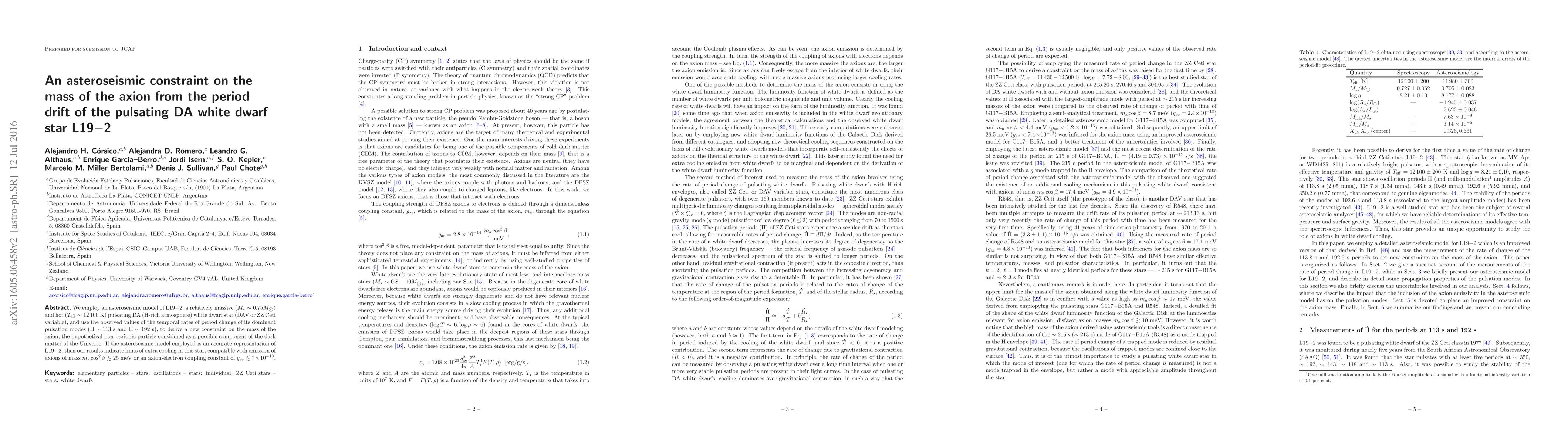 We employ an asteroseismic model of L19-2, a relatively massive ($M_{\star} \sim 0.75 M_{\sun}$) and hot ($T_{\rm eff} \sim 12\,100$ K) pulsating DA (H-rich atmosphere) white dwarf star (DAV or ZZ Ceti variable), and use the observed values of the temporal rates of period change of its dominant pulsation modes ($\Pi \sim 113$ s and $\Pi \sim 192$ s), to derive a new constraint on the mass of the axion, the hypothetical non-barionic particle considered as a possible component of the dark matter of the Universe. If the asteroseismic model employed is an accurate representation of L19-2, then our results indicate hints of extra cooling in this star, compatible with emission of axions of mass $m_{\rm a} \cos^2 \beta \lesssim 25$ meV or an axion-electron coupling constant of $g_{\rm ae} \lesssim 7 \times 10^{-13}$.