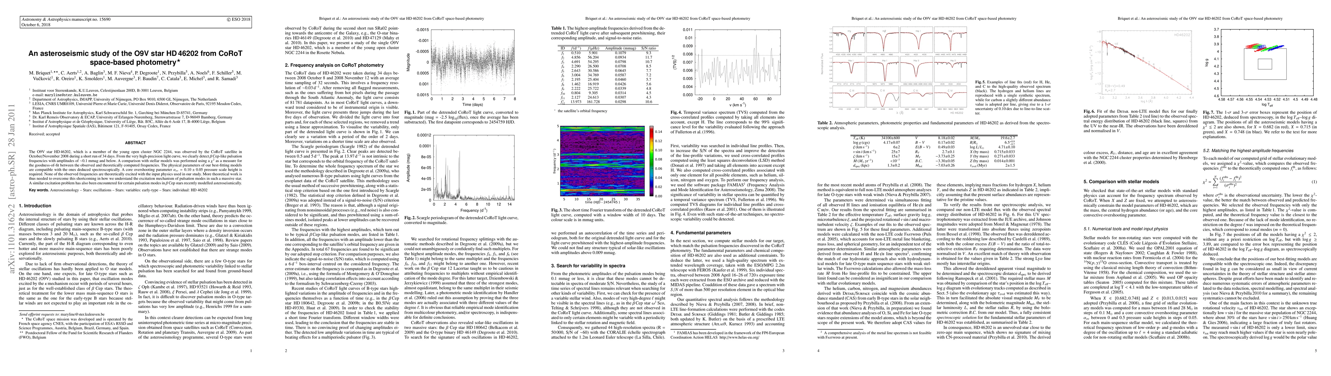 The O9V star HD 46202, which is a member of the young open cluster NGC 2244, was observed by the CoRoT satellite in October/November 2008 during a short run of 34 days. From the very high-precision light curve, we clearly detect beta Cep-like pulsation frequencies with amplitudes of ~0.1 mmag and below. A comparison with stellar models was performed using a chi^2 as a measure for the goodness-of-fit between the observed and theoretically computed frequencies. The physical parameters of our best-fitting models are compatible with the ones deduced spectroscopically. A core overshooting parameter alpha_ov = 0.10 +- 0.05 pressure scale height is required. None of the observed frequencies are theoretically excited with the input physics used in our study. More theoretical work is thus needed to overcome this shortcoming in how we understand the excitation mechanism of pulsation modes in such a massive star. A similar excitation problem has also been encountered for certain pulsation modes in beta Cep stars recently modelled asteroseismically.