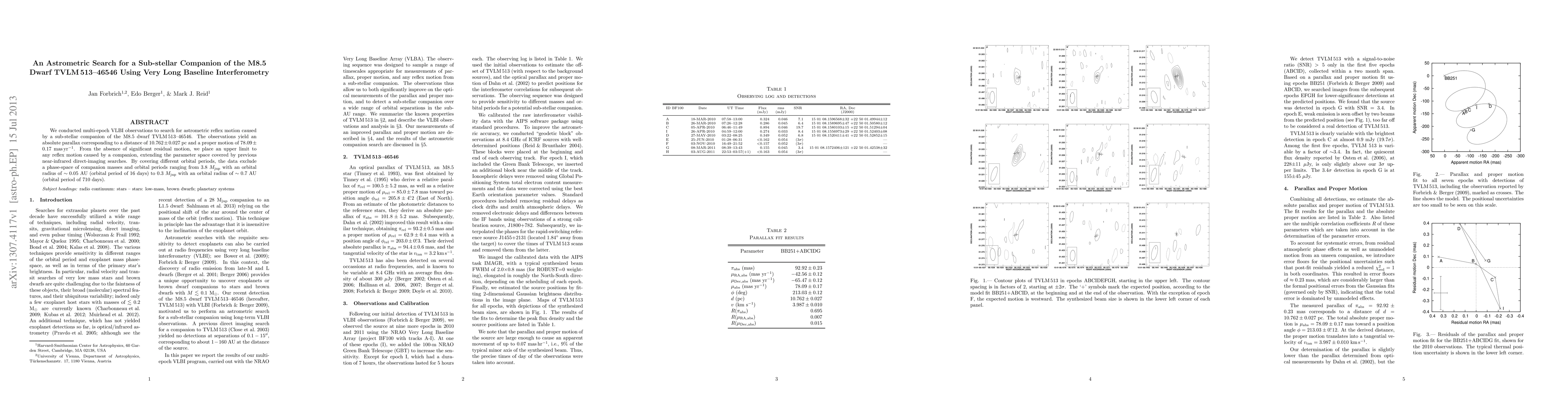 We conducted multi-epoch VLBI observations to search for astrometric reflex motion caused by a sub-stellar companion of the M8.5 dwarf TVLM 513-46546. The observations yield an absolute parallax corresponding to a distance of 10.762+/-0.027 pc and a proper motion of 78.09+/-0.17 mas/yr. From the absence of significant residual motion, we place an upper limit to any reflex motion caused by a companion, extending the parameter space covered by previous near-infrared direct-imaging searches. By covering different orbital periods, the data exclude a phase-space of companion masses and orbital periods ranging from 3.8 Mjup with an orbital radius of ~0.05 AU (orbital period of 16 days) to 0.3 Mjup with an orbital radius of ~0.7 AU (orbital period of 710 days).