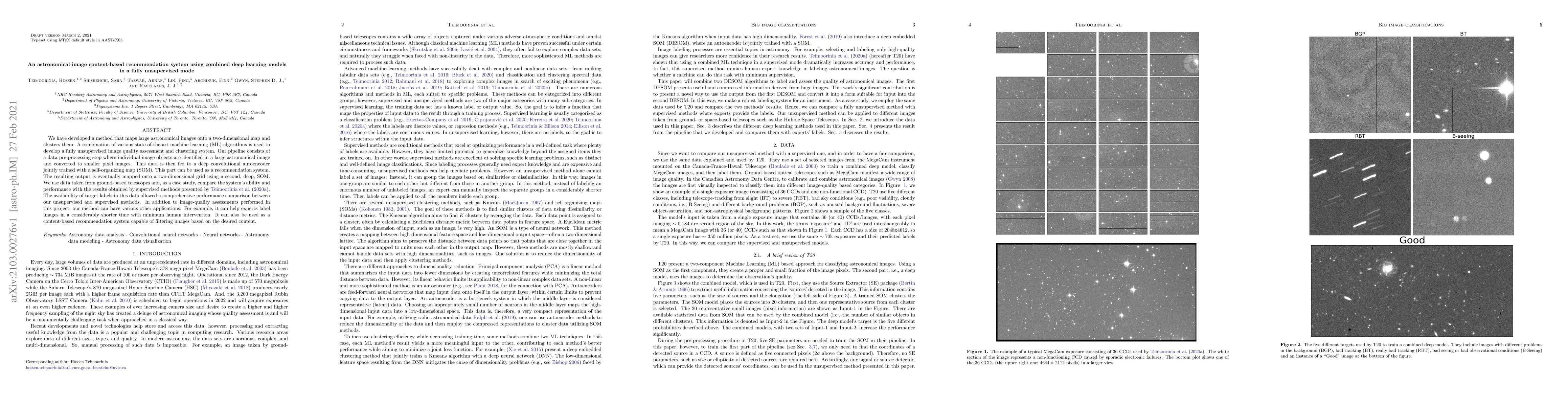 This paper presents a fully unsupervised deep learning system for recommending astronomical images, utilizing a combination of convolutional autoencoders and self-organizing maps for clustering and quality assessment. The method can efficiently label images and serve as a content-based recommendation system, as demonstrated by its comparison with supervised methods.