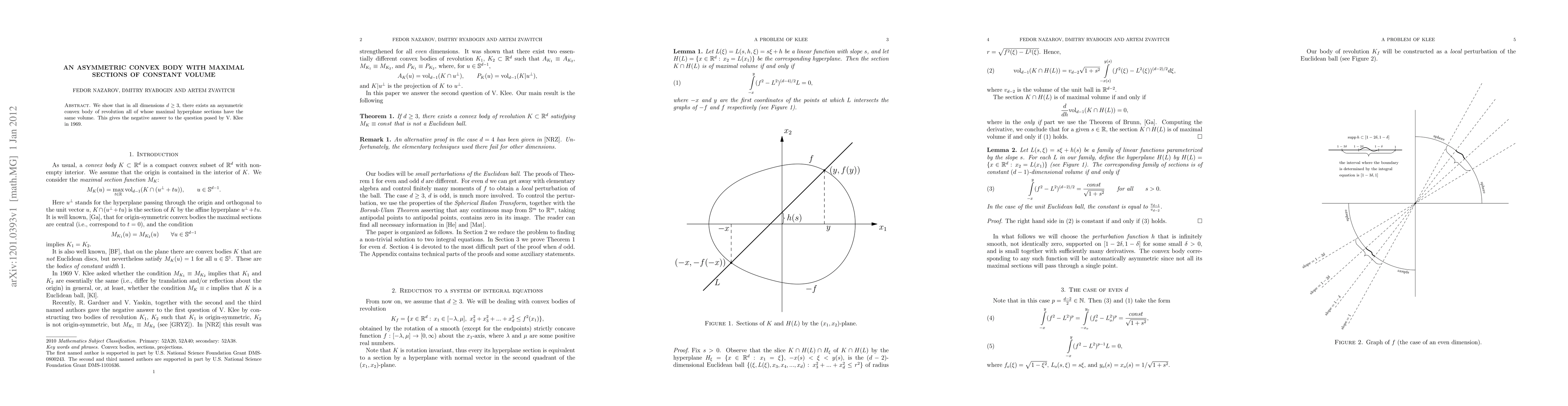 This paper demonstrates the existence of an asymmetric convex body of revolution in dimensions d>2 where all maximal hyperplane sections have equal volume, thus providing a negative resolution to V. Klee's 1969 question.