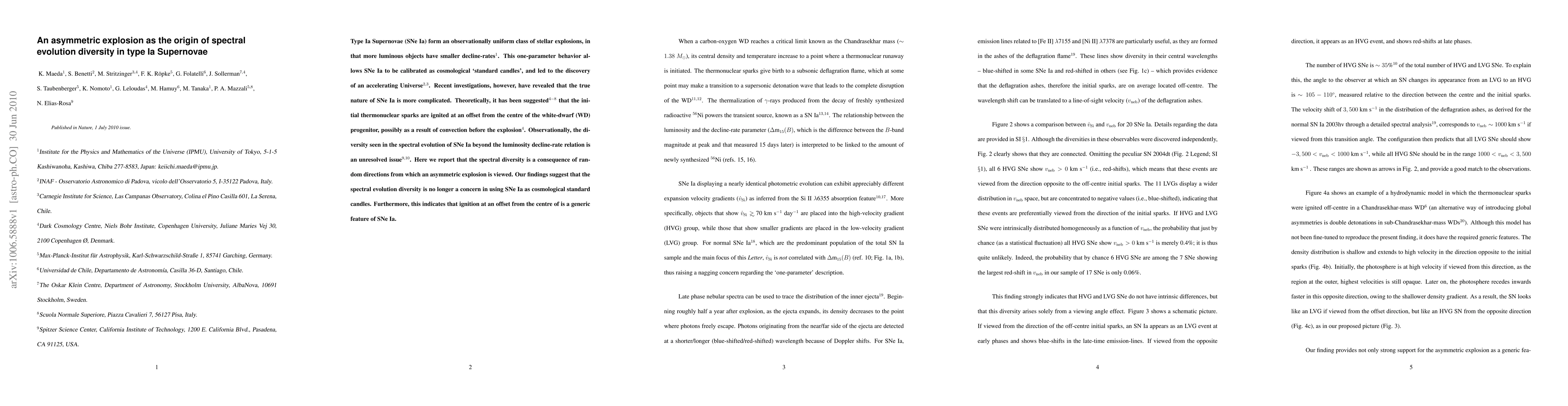 Type Ia Supernovae (SNe Ia) form an observationally uniform class of stellar explosions, in that more luminous objects have smaller decline-rates. This one-parameter behavior allows SNe Ia to be calibrated as cosmological `standard candles', and led to the discovery of an accelerating Universe. Recent investigations, however, have revealed that the true nature of SNe Ia is more complicated. Theoretically, it has been suggested that the initial thermonuclear sparks are ignited at an offset from the centre of the white-dwarf (WD) progenitor, possibly as a result of convection before the explosion. Observationally, the diversity seen in the spectral evolution of SNe Ia beyond the luminosity decline-rate relation is an unresolved issue. Here we report that the spectral diversity is a consequence of random directions from which an asymmetric explosion is viewed. Our findings suggest that the spectral evolution diversity is no longer a concern in using SNe Ia as cosmological standard candles. Furthermore, this indicates that ignition at an offset from the centre of is a generic feature of SNe Ia.
