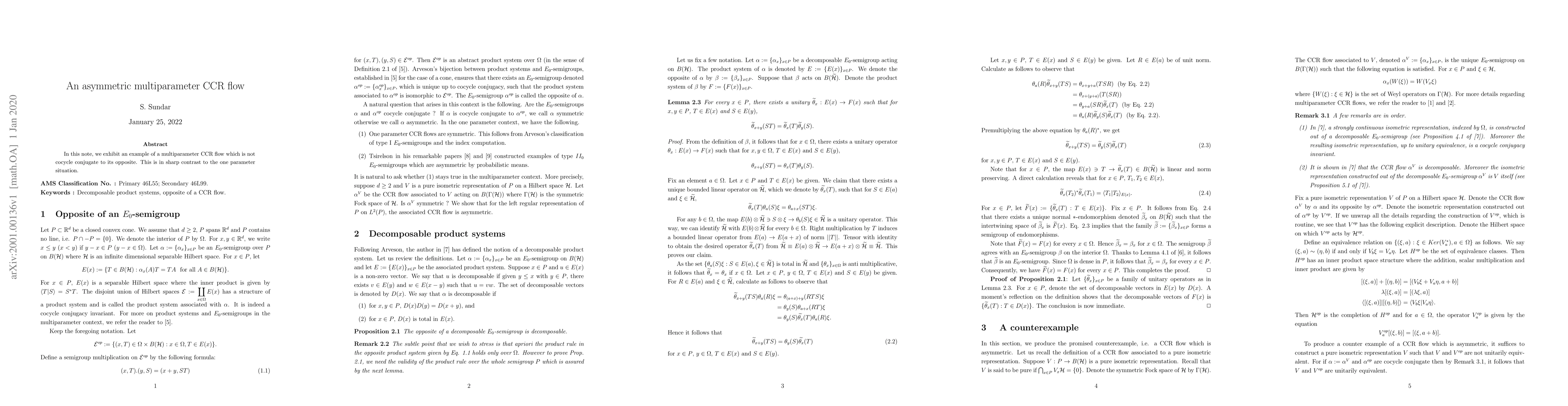 Summary: The paper presents an example of a multiparameter CCR flow that is not cocycle conjugate to its opposite, contrasting with the one-parameter situation where such flows typically are. This highlights a significant difference in behavior between one- and multi-parameter CCR flows.