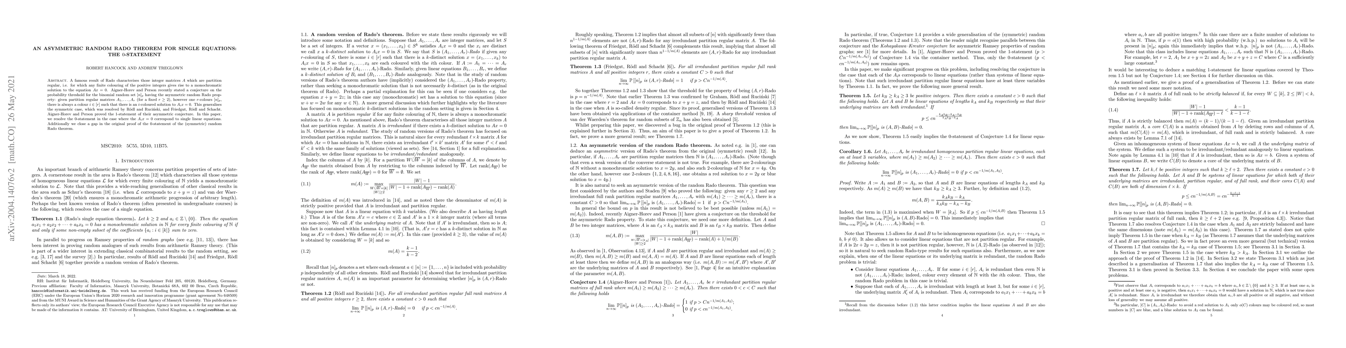 A famous result of Rado characterises those integer matrices $A$ which are partition regular, i.e. for which any finite colouring of the positive integers gives rise to a monochromatic solution to the equation $Ax=0$. Aigner-Horev and Person recently stated a conjecture on the probability threshold for the binomial random set $[n]_p$ having the asymmetric random Rado property: given partition regular matrices $A_1, \dots, A_r$ (for a fixed $r \geq 2$), however one $r$-colours $[n]_p$, there is always a colour $i \in [r]$ such that there is an $i$-coloured solution to $A_i x=0$. This generalises the symmetric case, which was resolved by R\"odl and Ruci\'nski, and Friedgut, R\"odl and Schacht. Aigner-Horev and Person proved the $1$-statement of their asymmetric conjecture. In this paper, we resolve the $0$-statement in the case where the $A_i x=0$ correspond to single linear equations. Additionally we close a gap in the original proof of the 0-statement of the (symmetric) random Rado theorem.