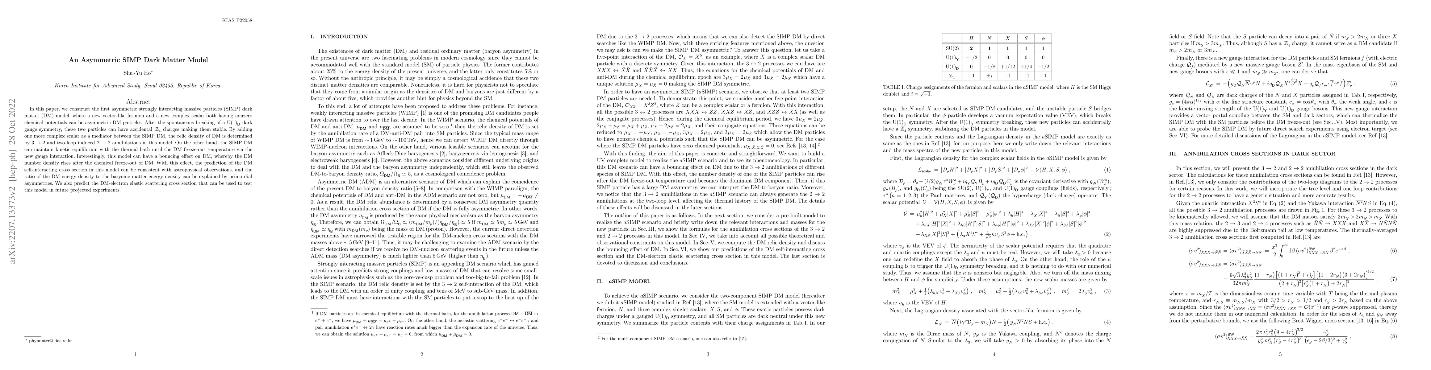In this paper, we construct the first asymmetric strongly interacting massive particles (SIMP) dark matter (DM) model, where a new vector-like fermion and a new complex scalar both having nonzero chemical potentials can be asymmetric DM particles. After the spontaneous breaking of a U(1)$^{}_\textsf{D}$ dark gauge symmetry, these two particles can have accidental $\mathbb{Z}^{}_4$ charges making them stable. By adding one more complex scalar as a mediator between the SIMP DM, the relic density of DM is determined by $3 \to 2$ and two-loop induced $2 \to 2$ annihilations in this model. On the other hand, the SIMP DM can maintain kinetic equilibrium with the thermal bath until the DM freeze-out temperature via the new gauge interaction. Interestingly, this model can have a bouncing effect on DM, whereby the DM number density rises after the chemical freeze-out of DM. With this effect, the prediction of the DM self-interacting cross section in this model can be consistent with astrophysical observations, and the ratio of the DM energy density to the baryonic matter energy density can be explained by primordial asymmetries. We also predict the DM-electron elastic scattering cross section that can be used to test this model in future projected experiments.