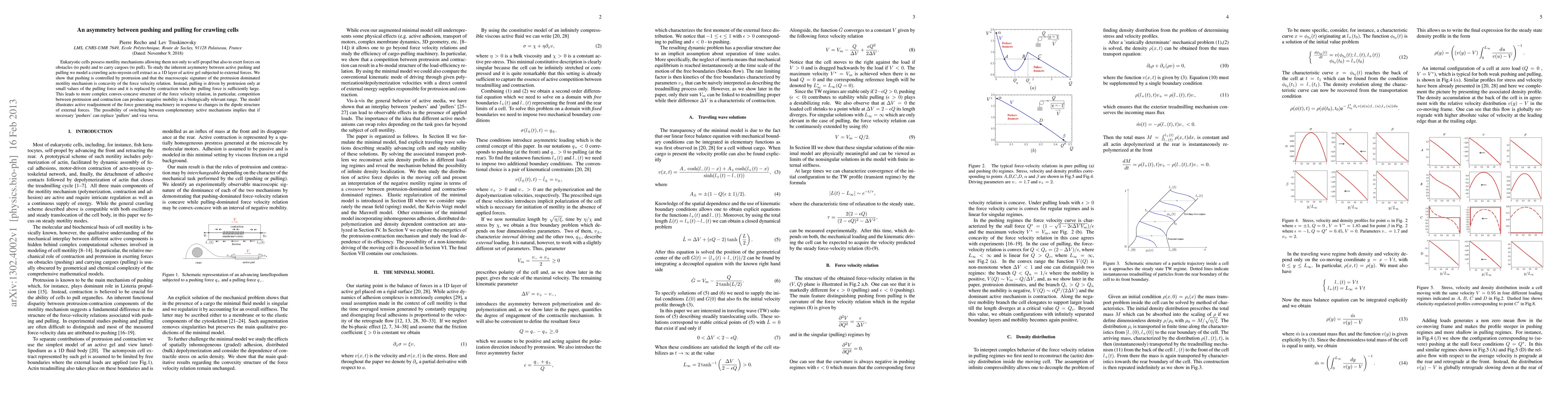 This paper models eukaryotic cell motility to reveal an asymmetry between pushing and pulling mechanisms. It finds that pushing is primarily driven by protrusion, while pulling involves both protrusion and contraction, leading to complex force-velocity relations and the potential for negative mobility.