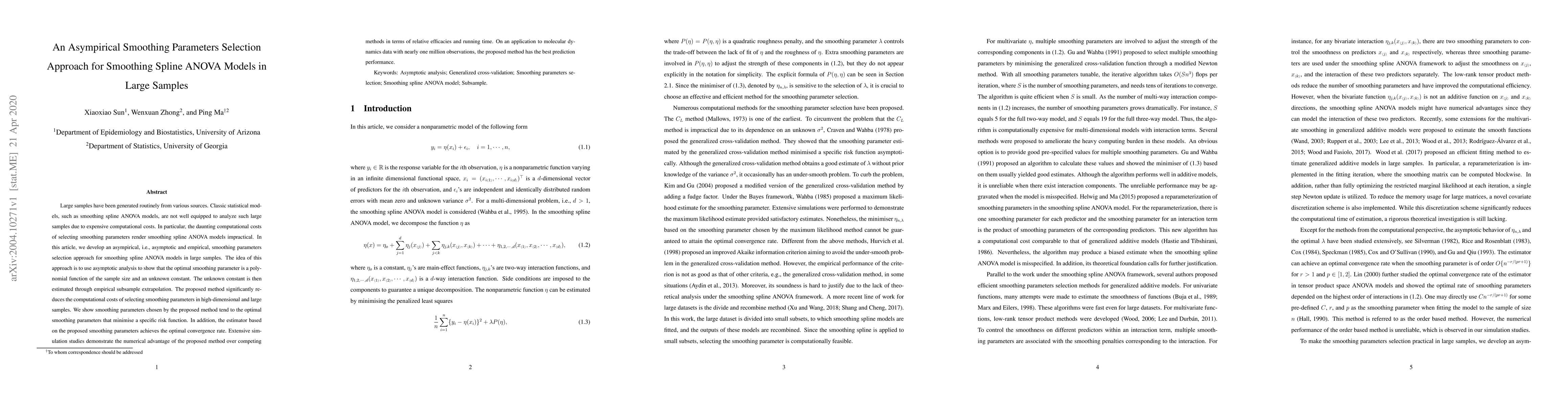 This paper proposes an asympirical approach for selecting smoothing parameters in smoothing spline ANOVA models, significantly reducing computational costs in large samples. The method combines asymptotic analysis with empirical subsample extrapolation to achieve optimal convergence rates and superior prediction performance, as demonstrated through simulations and a molecular dynamics data application.