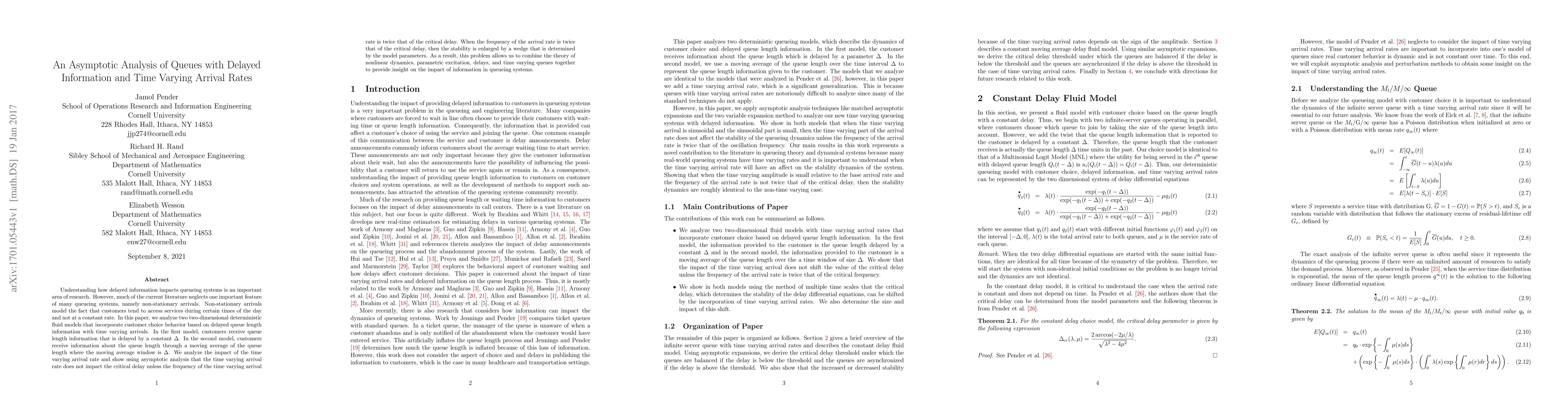 This paper analyzes two deterministic fluid models of queues with delayed information and time-varying arrival rates, showing that the critical delay stability is unaffected by time-varying arrivals unless their frequency is twice the critical delay frequency, in which case stability is enhanced by a model-dependent wedge. The study integrates nonlinear dynamics, parametric excitation, and delays to provide insights into information impacts on queueing systems.