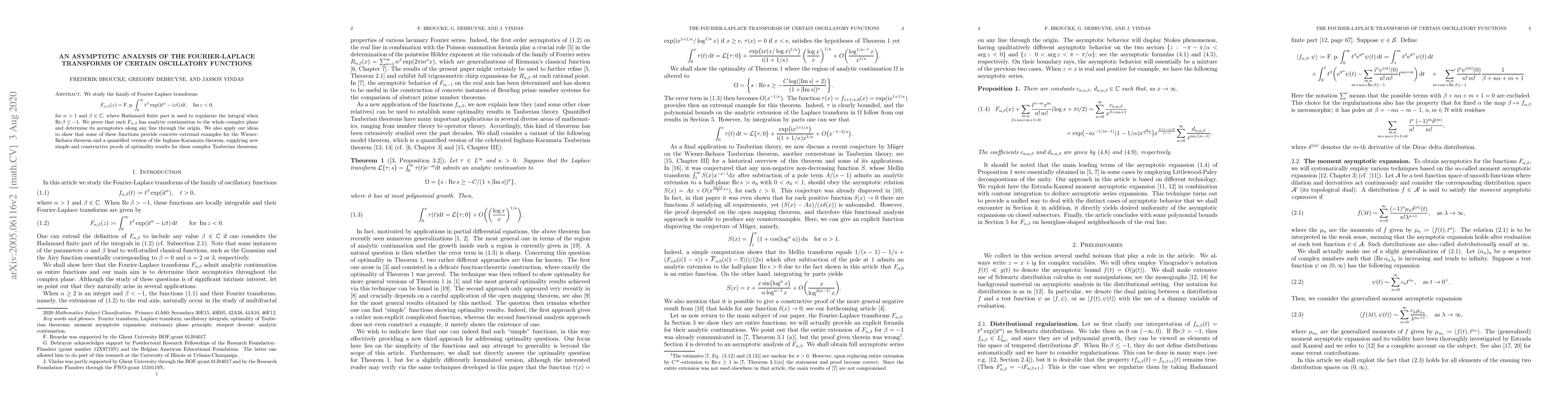 This paper investigates the Fourier-Laplace transforms of oscillatory functions, proving their analytic continuation across the complex plane and determining their asymptotic behavior along any line through the origin. It also demonstrates the optimality of these functions in the context of the Wiener-Ikehara and Ingham-Karamata theorems.