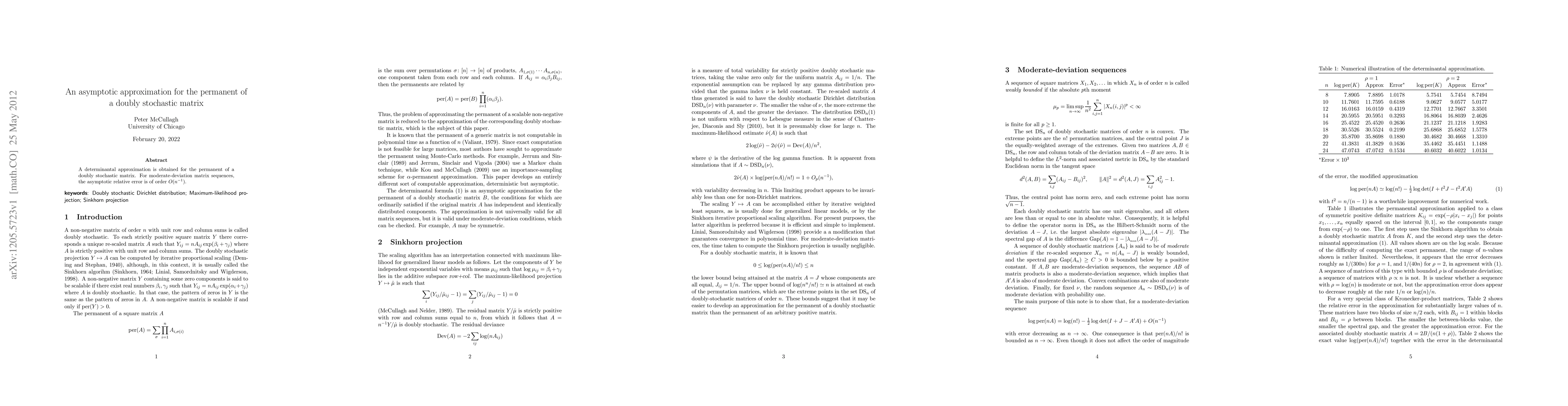 A determinantal approximation is obtained for the permanent of a doubly stochastic matrix. For moderate-deviation matrix sequences, the asymptotic relative error is of order $O(n^{-1})$.
