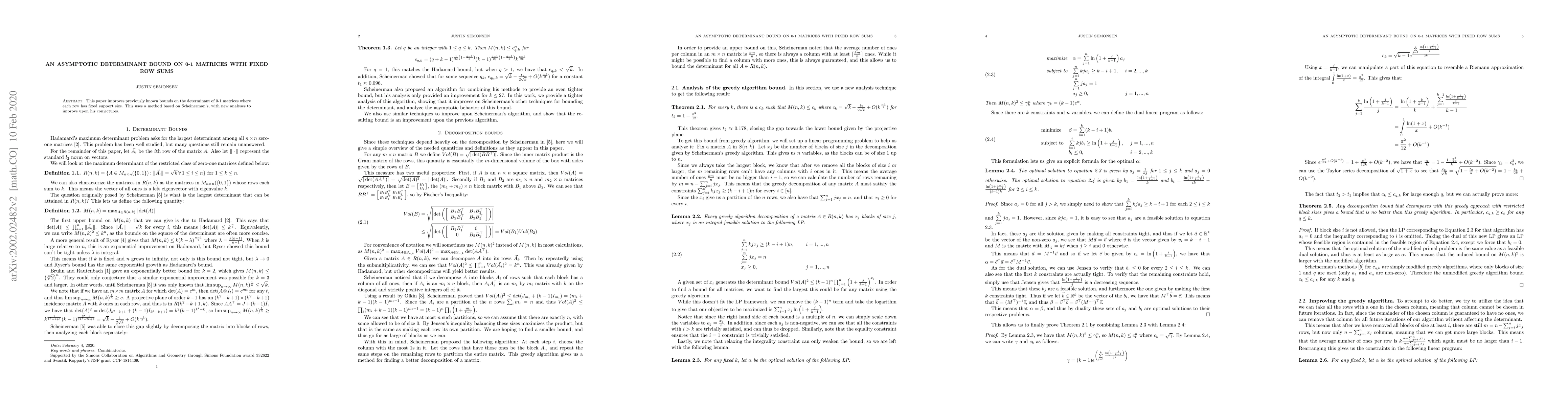 A new study improves previous bounds on the determinant of 0-1 matrices with fixed row sums, using a method based on Scheinerman's approach with new analyses.