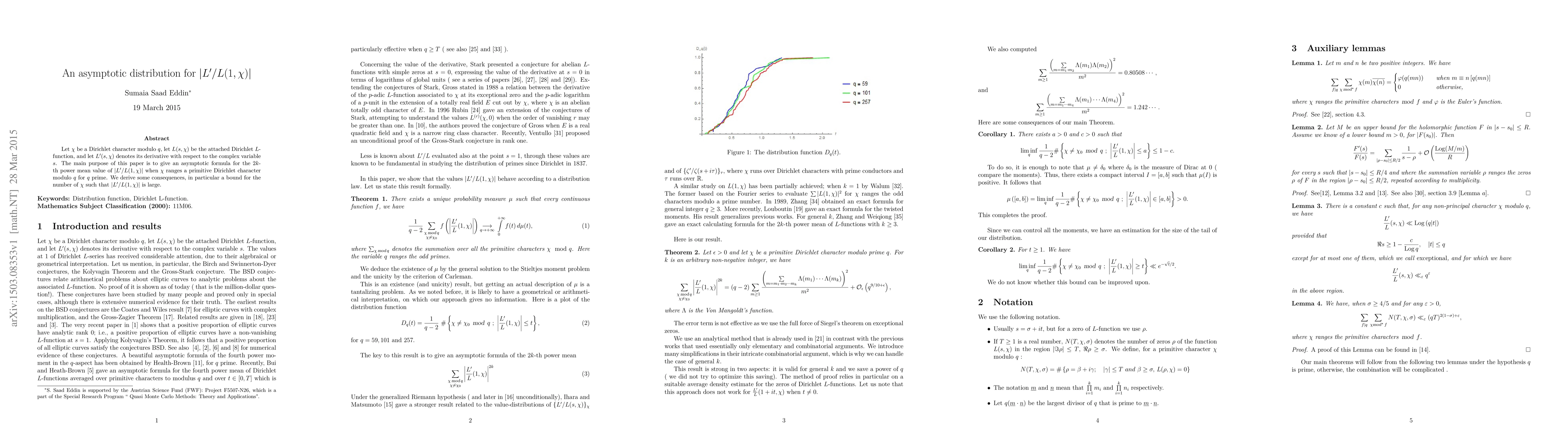 This paper derives an asymptotic formula for the $2k$-th power mean value of $\left|L^\prime/L(1,\chi)\right|$ for primitive Dirichlet characters modulo prime $q$, and provides a bound on the number of such characters where $\left|L^\prime/L(1,\chi)\right|$ is large.