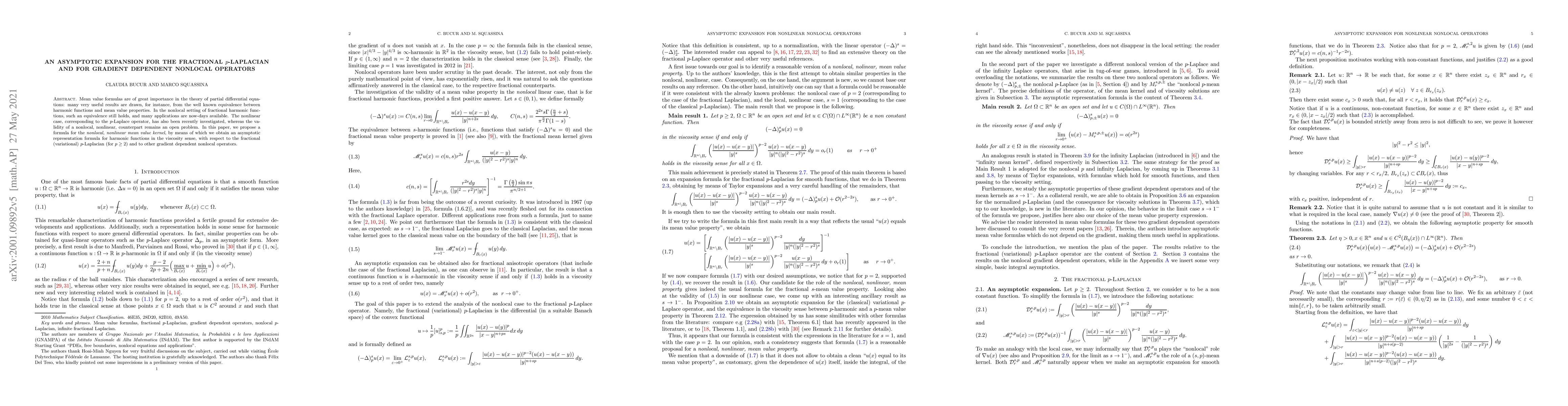 Mean value formulas are of great importance in the theory of partial differential equations: many very useful results are drawn, for instance, from the well known equivalence between harmonic functions and mean value properties. In the nonlocal setting of fractional harmonic functions, such an equivalence still holds, and many applications are now-days available. The nonlinear case, corresponding to the $p$-Laplace operator, has also been recently investigated, whereas the validity of a nonlocal, nonlinear, counterpart remains an open problem. In this paper, we propose a formula for the \emph{nonlocal, nonlinear mean value kernel}, by means of which we obtain an asymptotic representation formula for harmonic functions in the viscosity sense, with respect to the fractional (variational) $p$-Laplacian (for $p\geq 2$) and to other gradient dependent nonlocal operators.